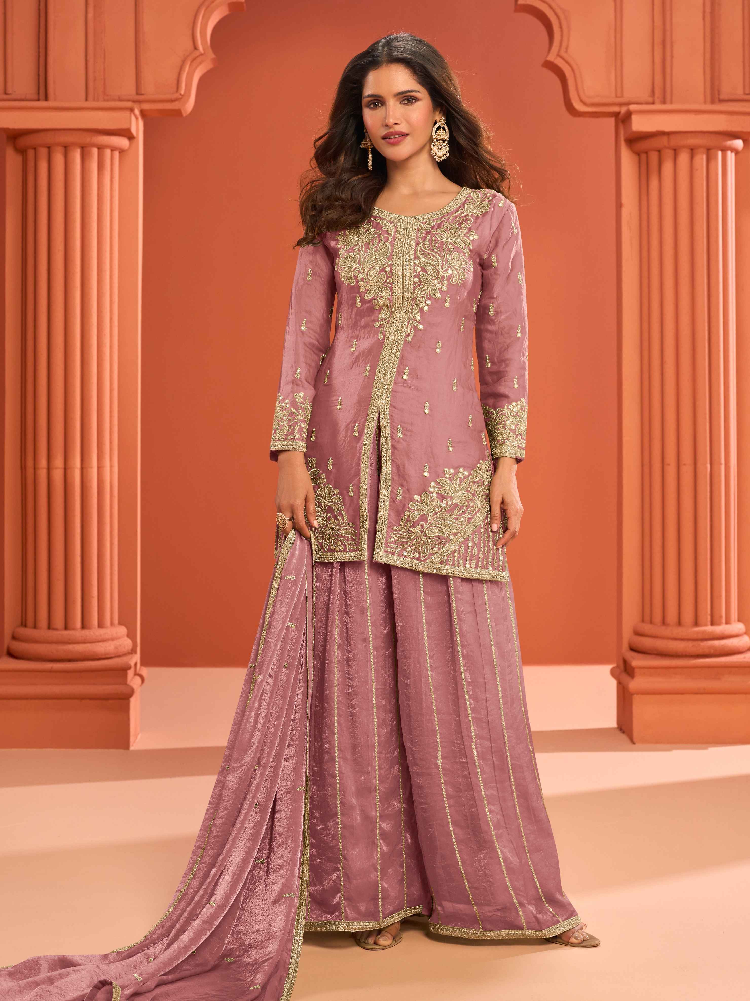 Dusty Rose Pink Real Fandy Silk Embroidered Kurti Palazzo Suit