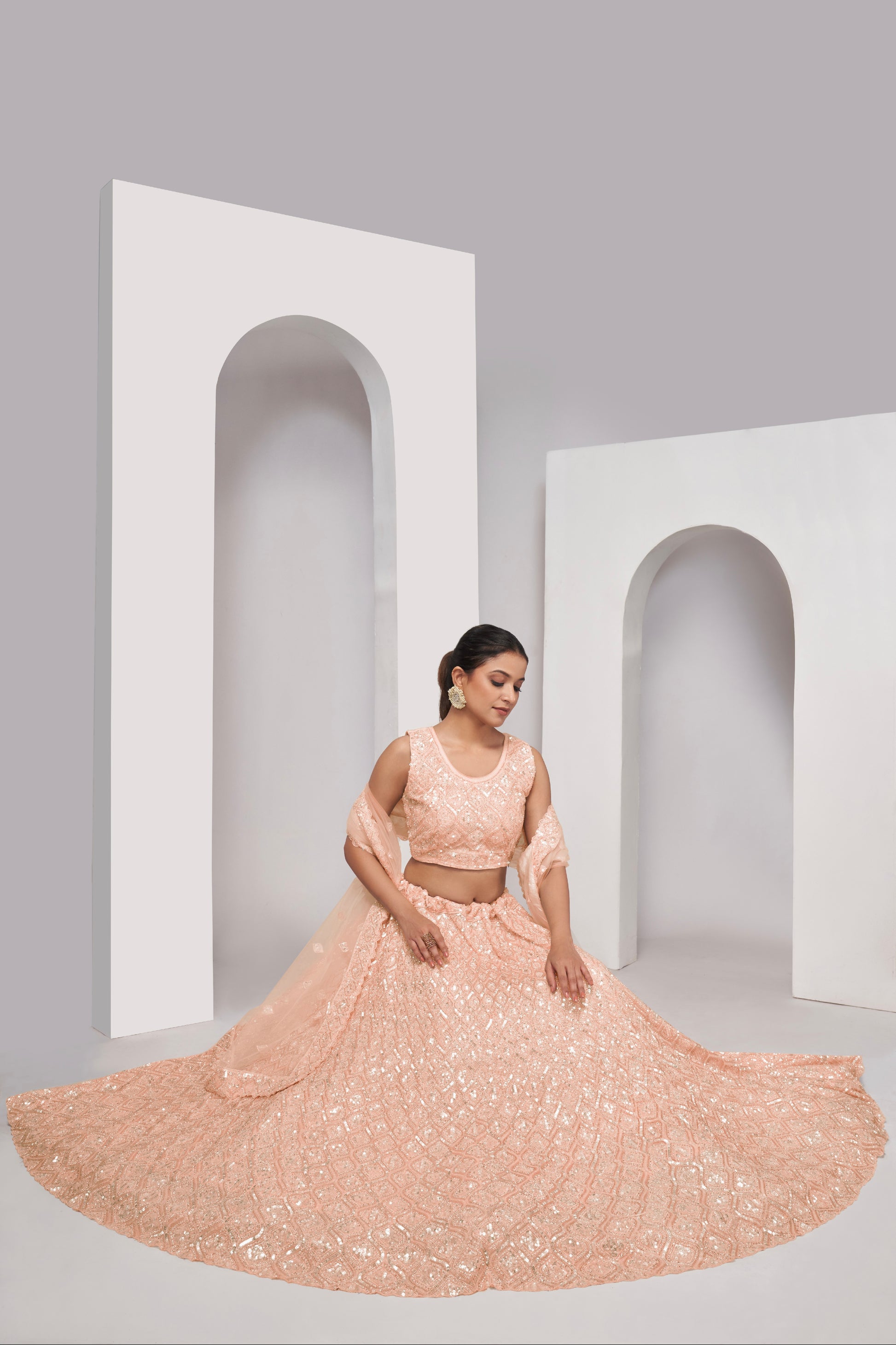 This elegant Peach Lehenga set features exquisite embroidery with illuminating sequin work threaded into diamond patterns. The intricate details and shimmering sequins make this outfit a dazzling choice for any special occasion. The design is further enhanced by the following features:
