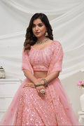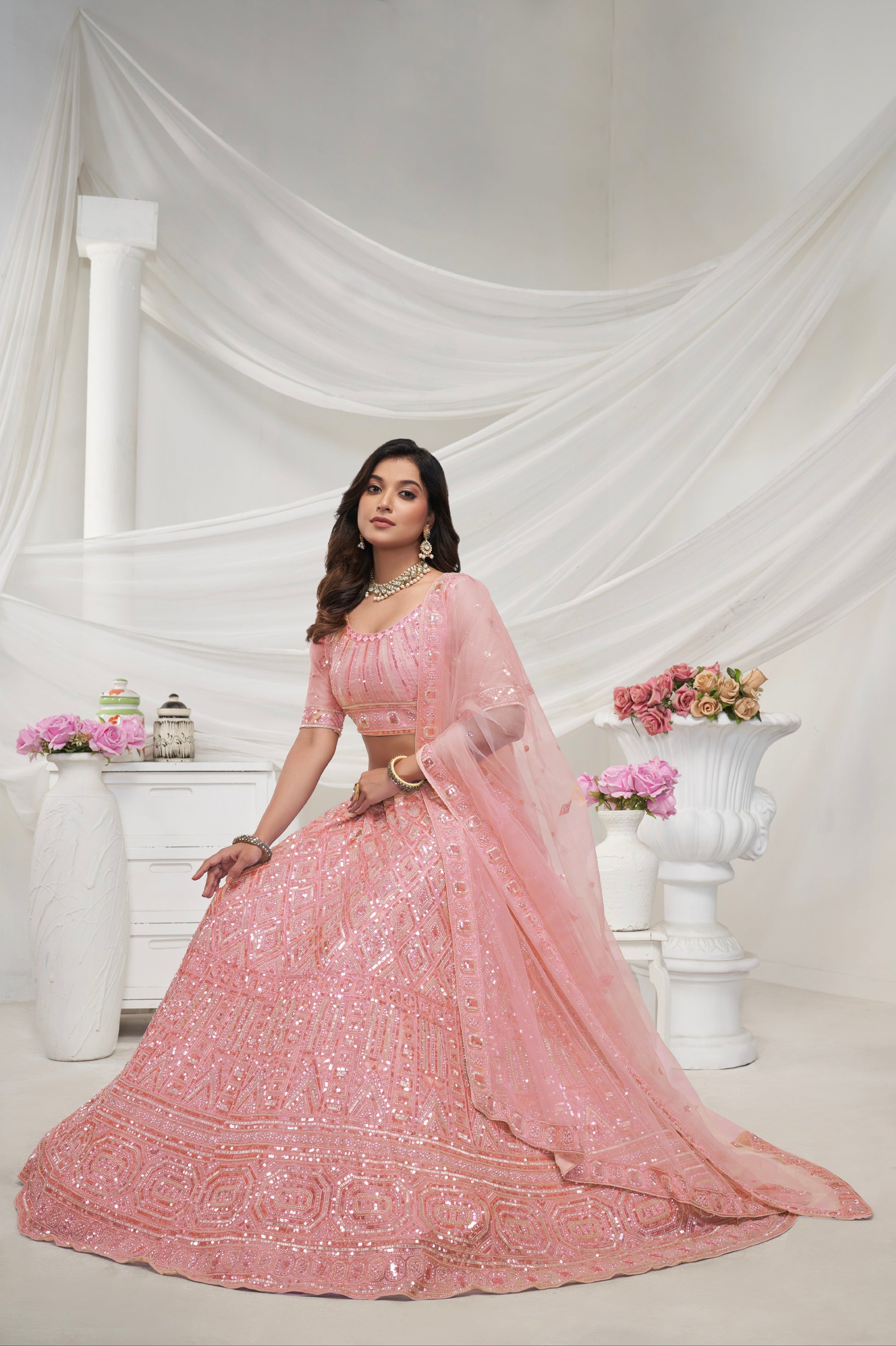 Elegant Peach Soft Net Lehenga Choli with Pearl & Diamond Sequin Work