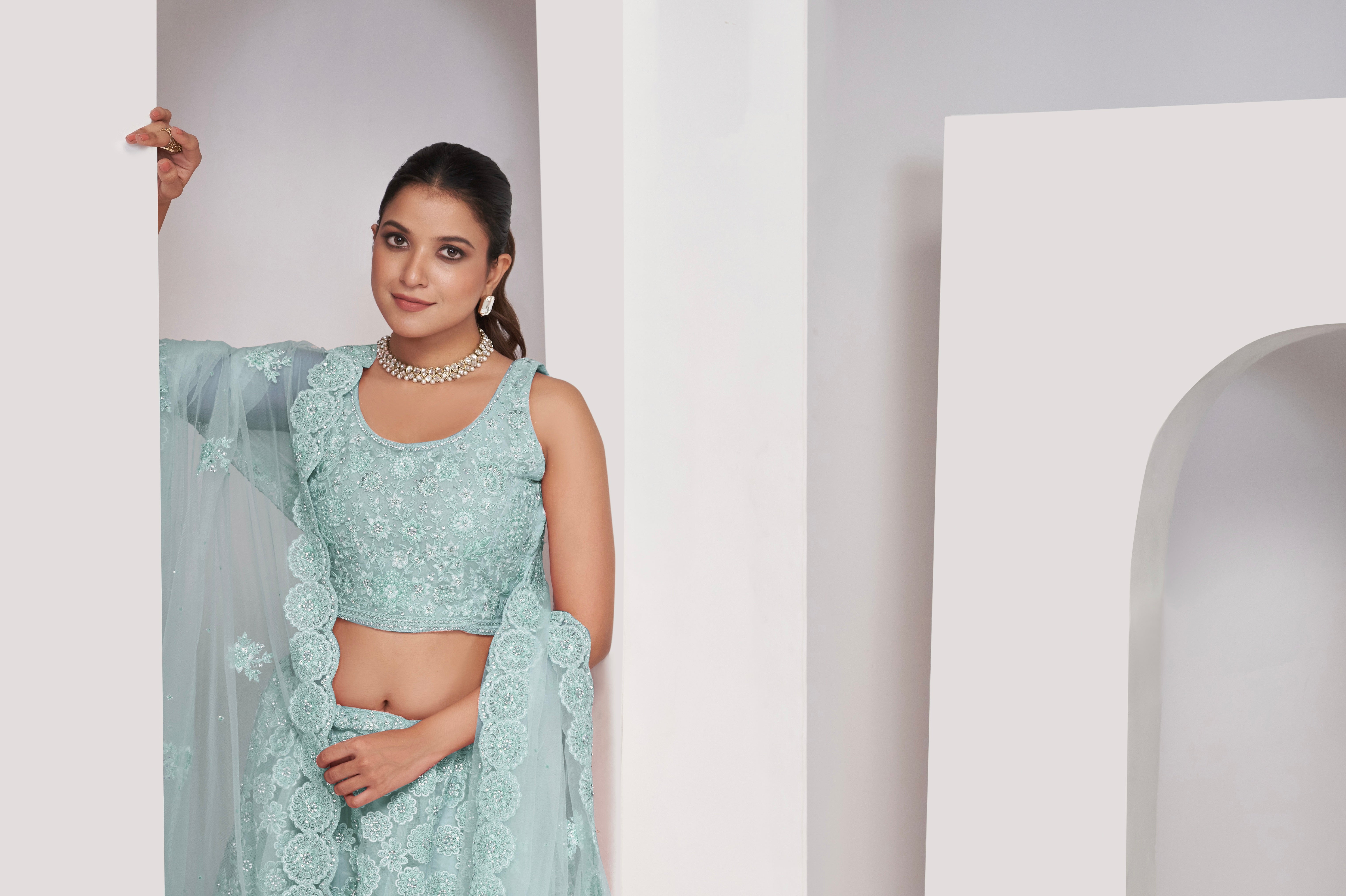 Fabric Details: Soft net fabric used for both lehenga and blouse, creating an ethereal look.