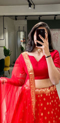 We know why red was, is, and will always be βtheβ colour of our desi shaadis! Here is a carefully created red jacquard silk lehenga choli with net dupatta and chosen outfit designed to βcompleteβ your BEST BRIDESMAID look for your upcoming wedding