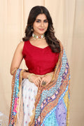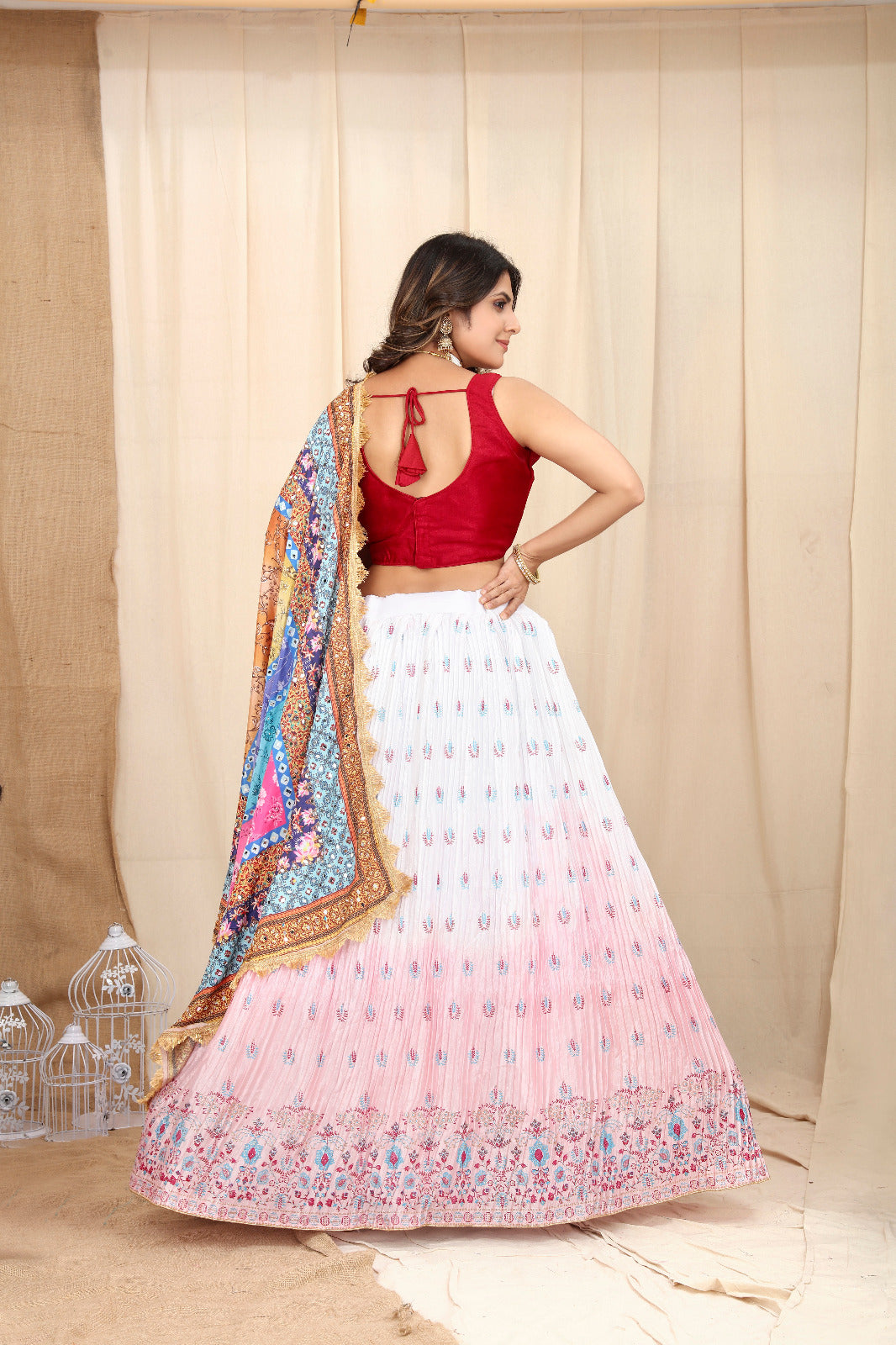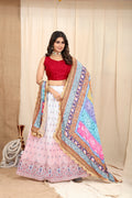 Get traditional touch to your look adorning this white-red color lehenga in chinnon material beautified with all-over zari work and block print work comes with micro crap inner with canvase inside.With real mirror work heavy duppta.