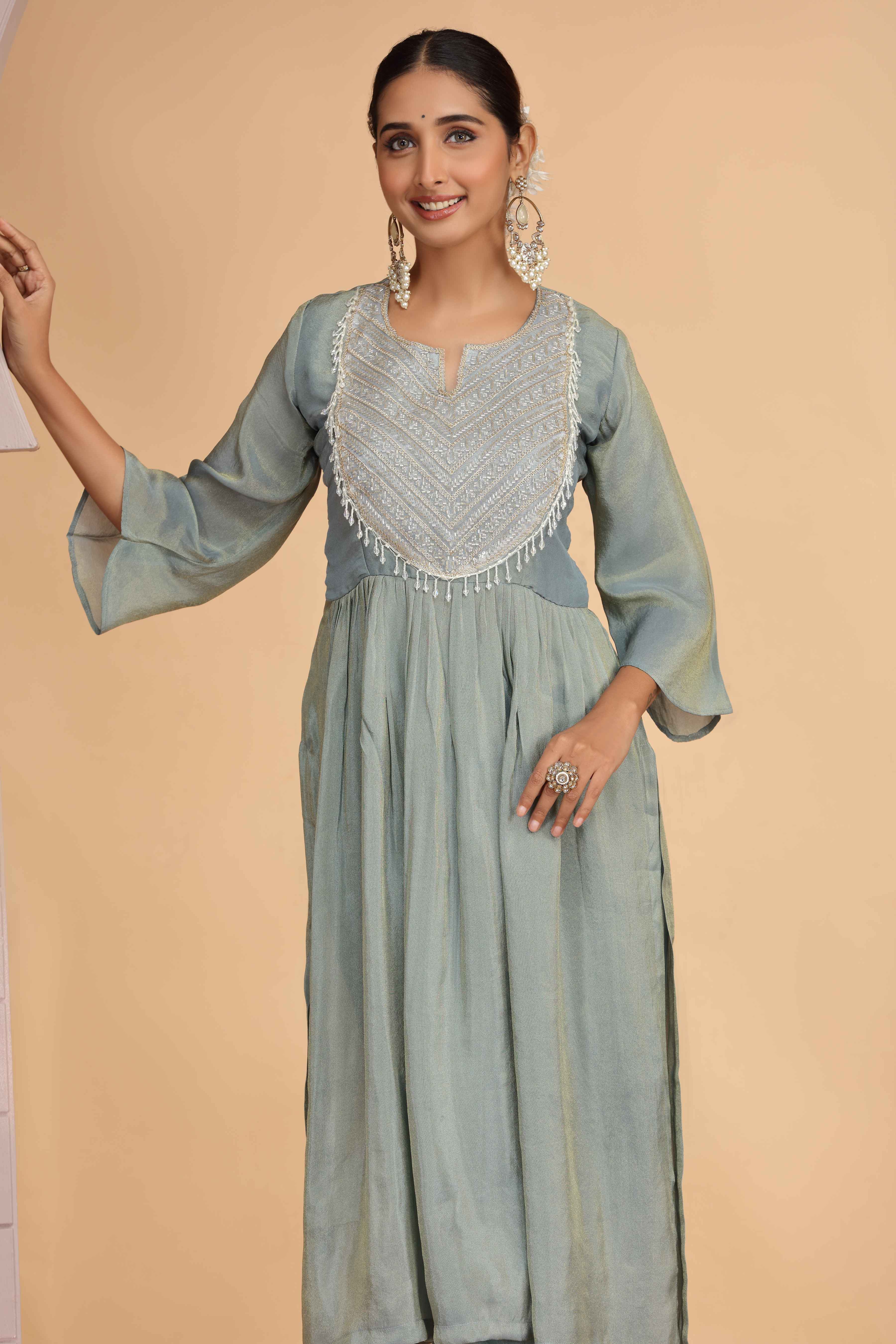 Firozi Shimmer Organza Pleated A-Line Kurta Pant Set
