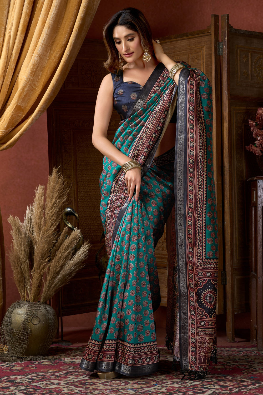 France Blue Pure Cluster Silk Ajarkh Digital Printed Saree