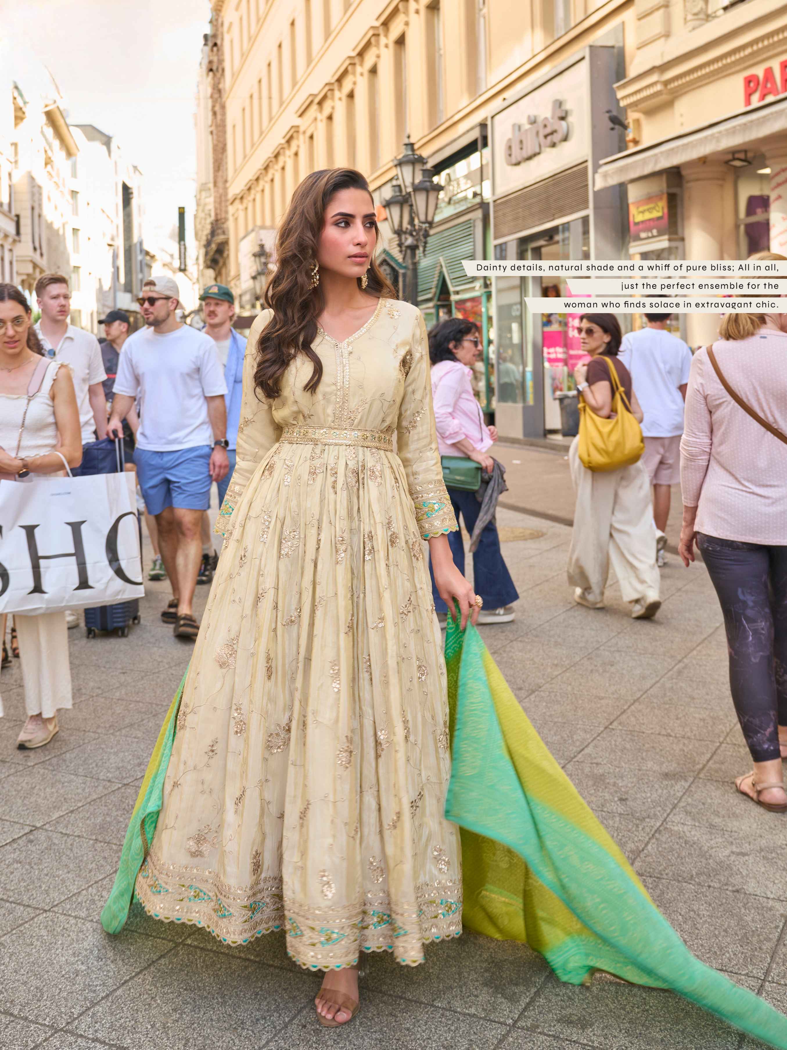Gold Cream Real Simar Silk Heavy Embroidered Gown