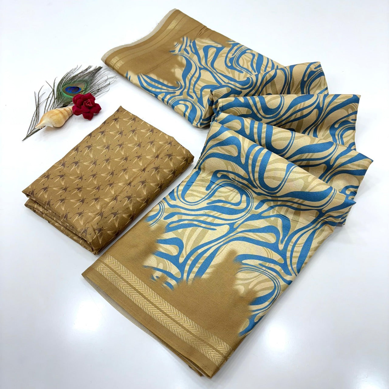 Gold Soft Tussar Silk Abstract Printed Zari Woven Saree Tussar Saree
