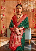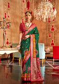 - Design: This saree features a classic Patola design with intricate patterns in green and pink. The contrasting colors create a sophisticated look.