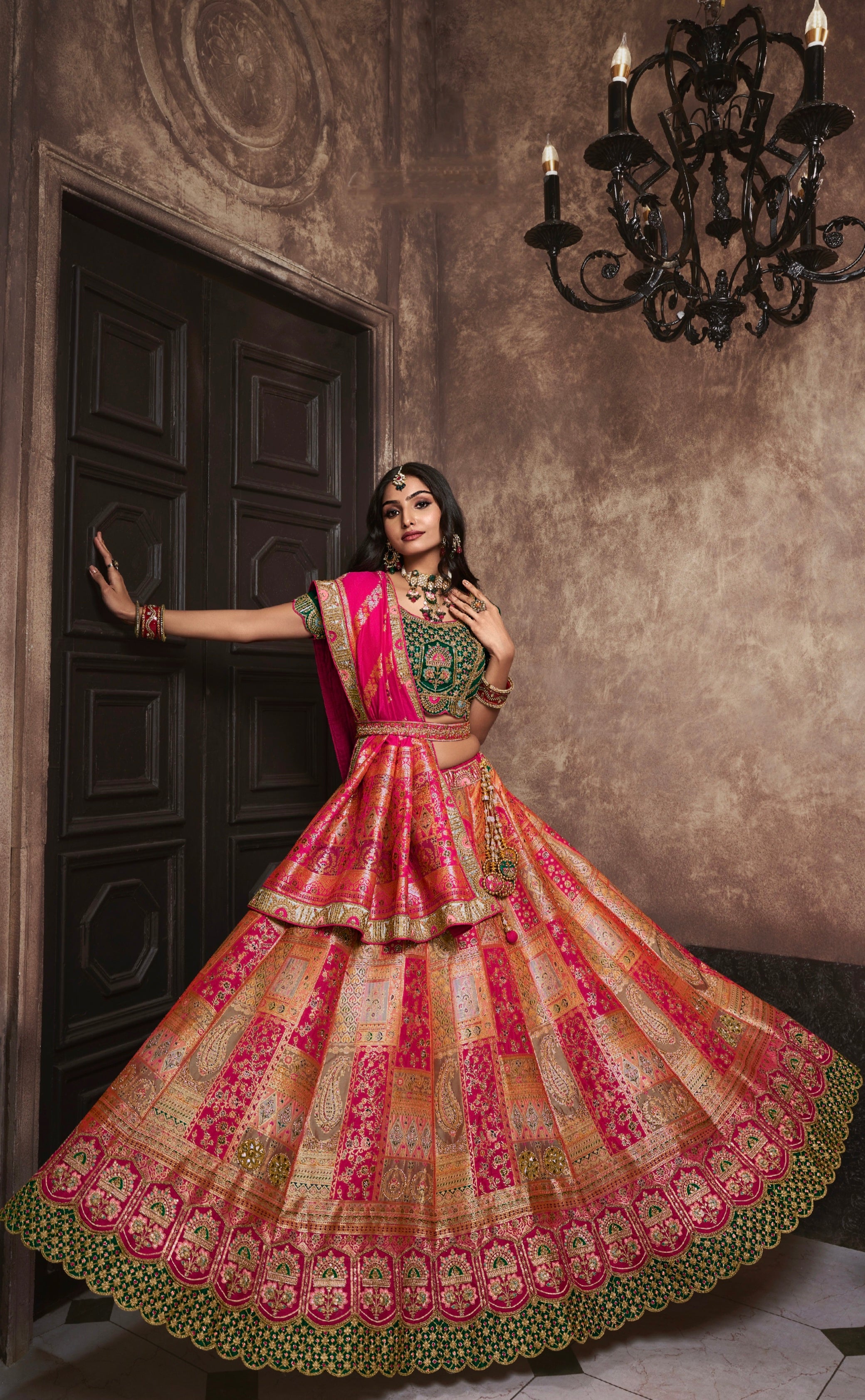 Green and Pink Zarkan Sequins Work Banarasi Lehenga