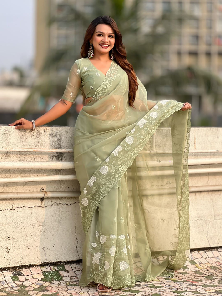 Green Pure Chandra Kora Silk Floral Embroidery Cutwork Saree