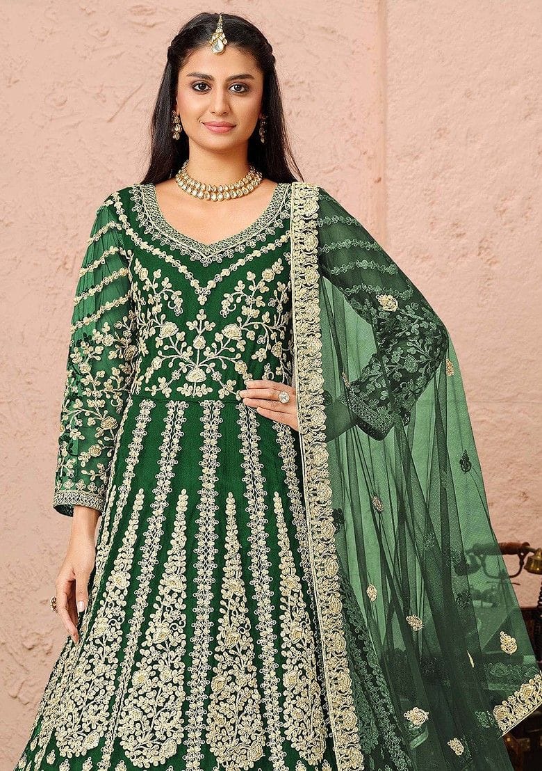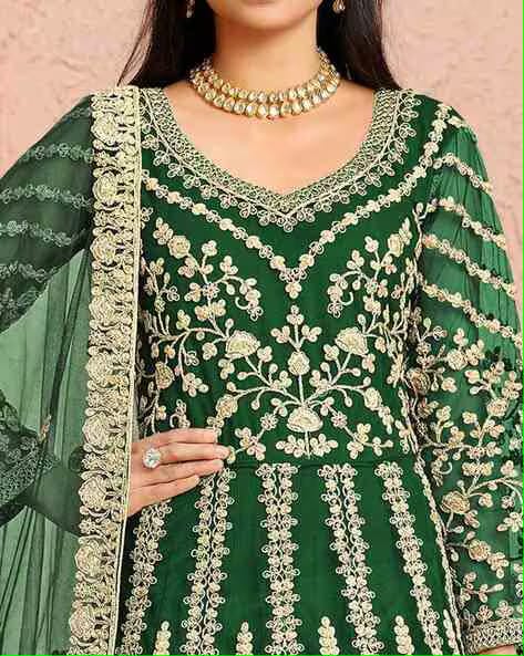 Green Pure Soft Net Long Floor Length Embroidered Work Readymade Gown