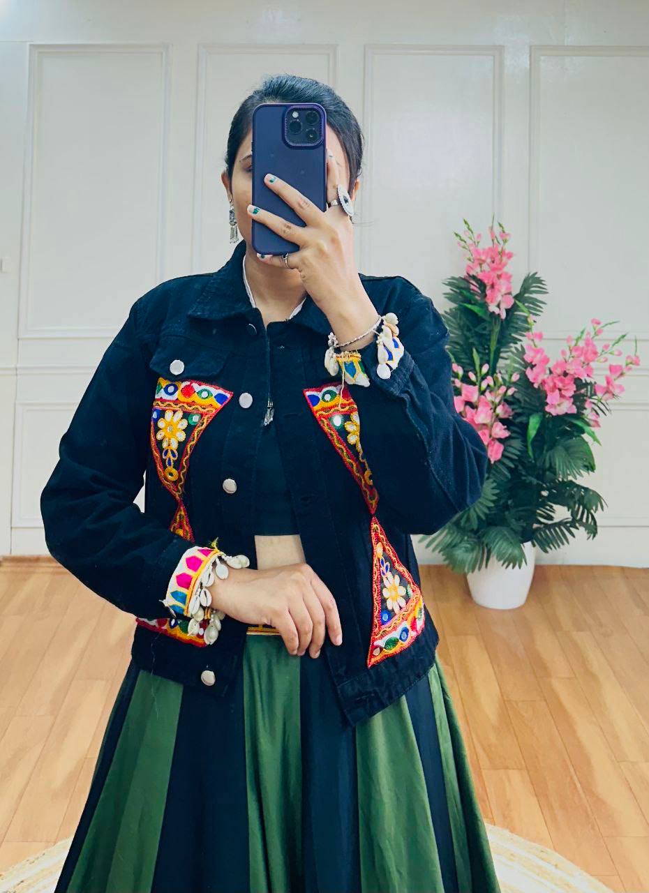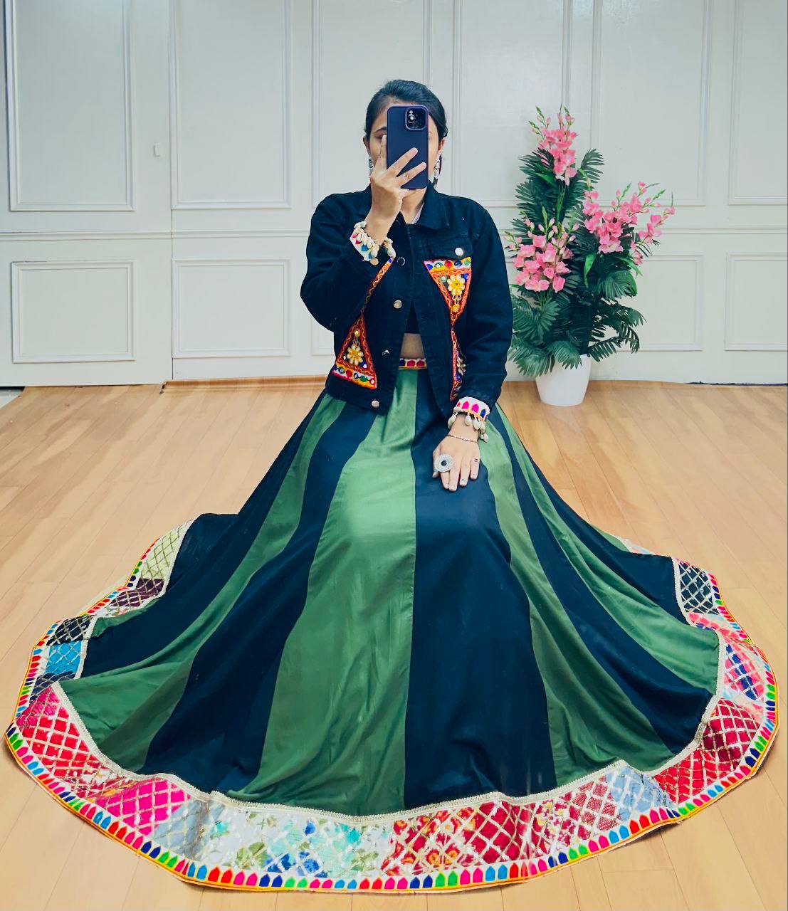 Green Pure Reyon Silk With Denim Jacket Navratri Lehenga Choli