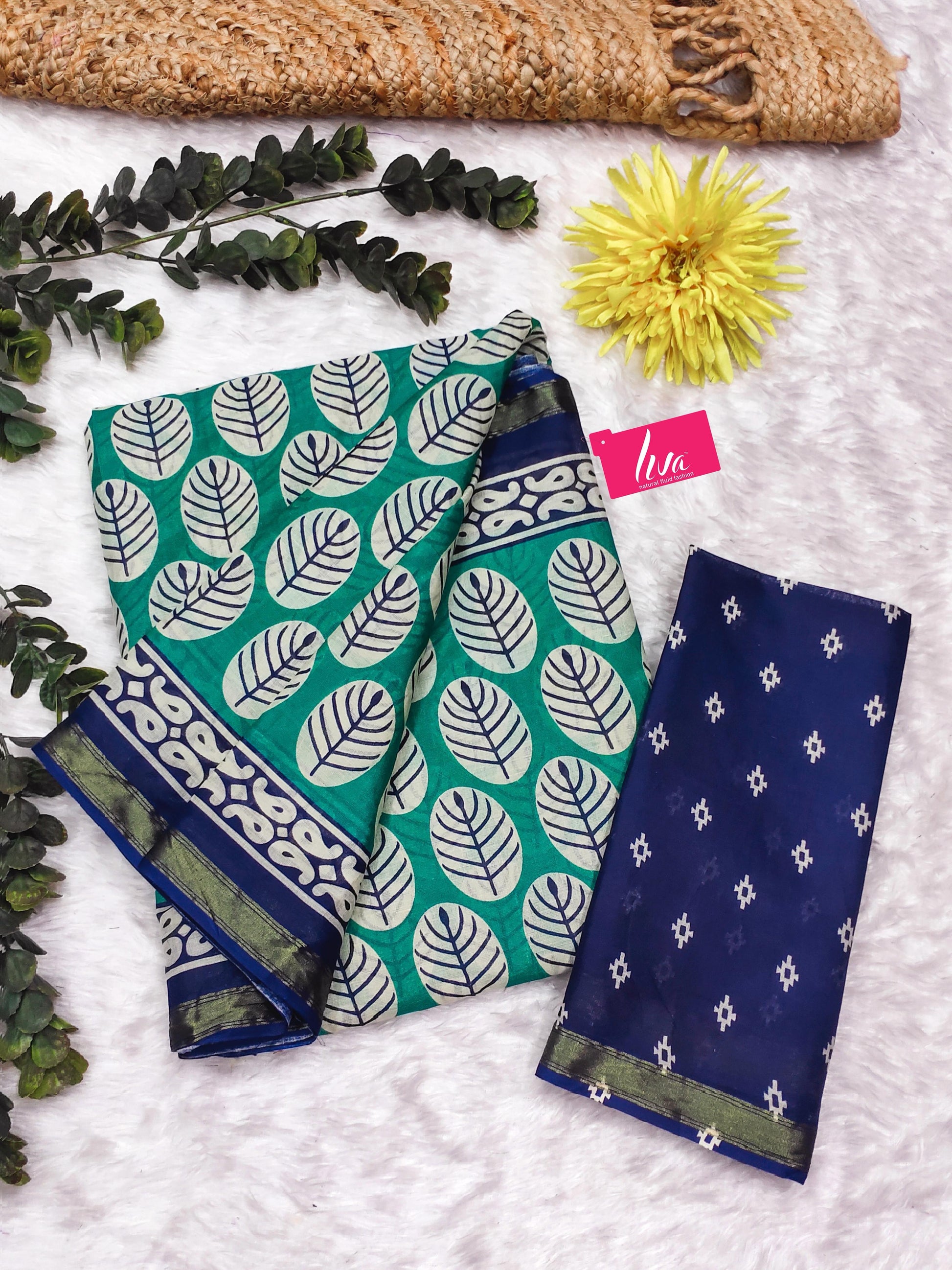 Green Pure Soft Mal Mal Cotton Bagru Block Print Saree