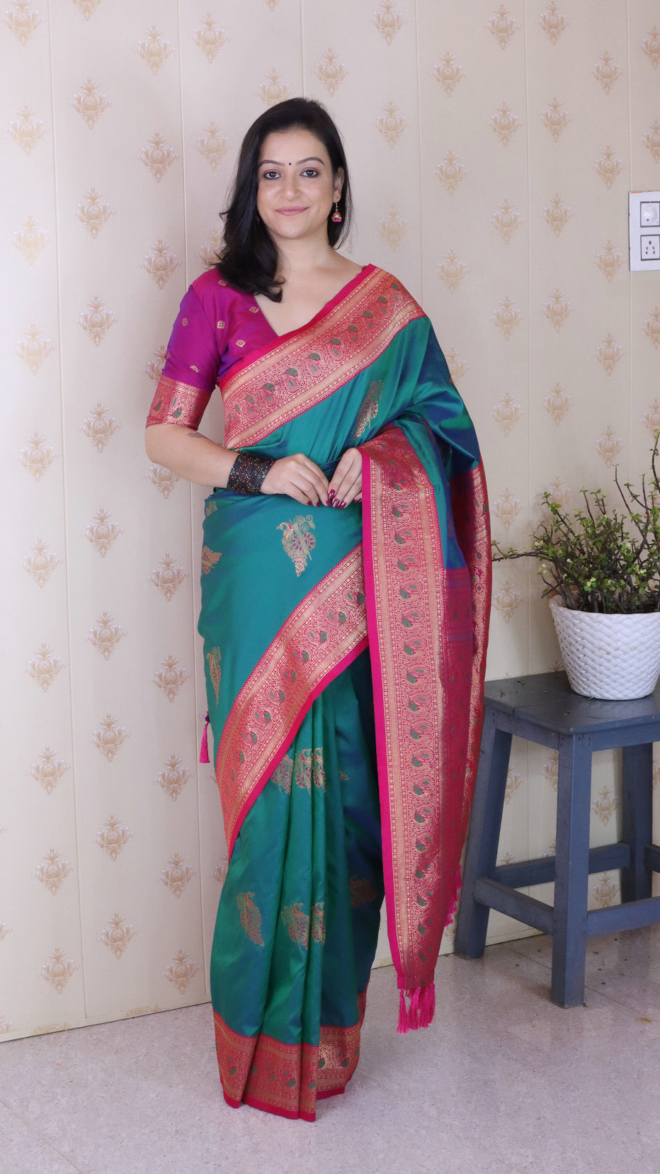 Green Soft Silk Banarasi Peacock Zari Woven Saree