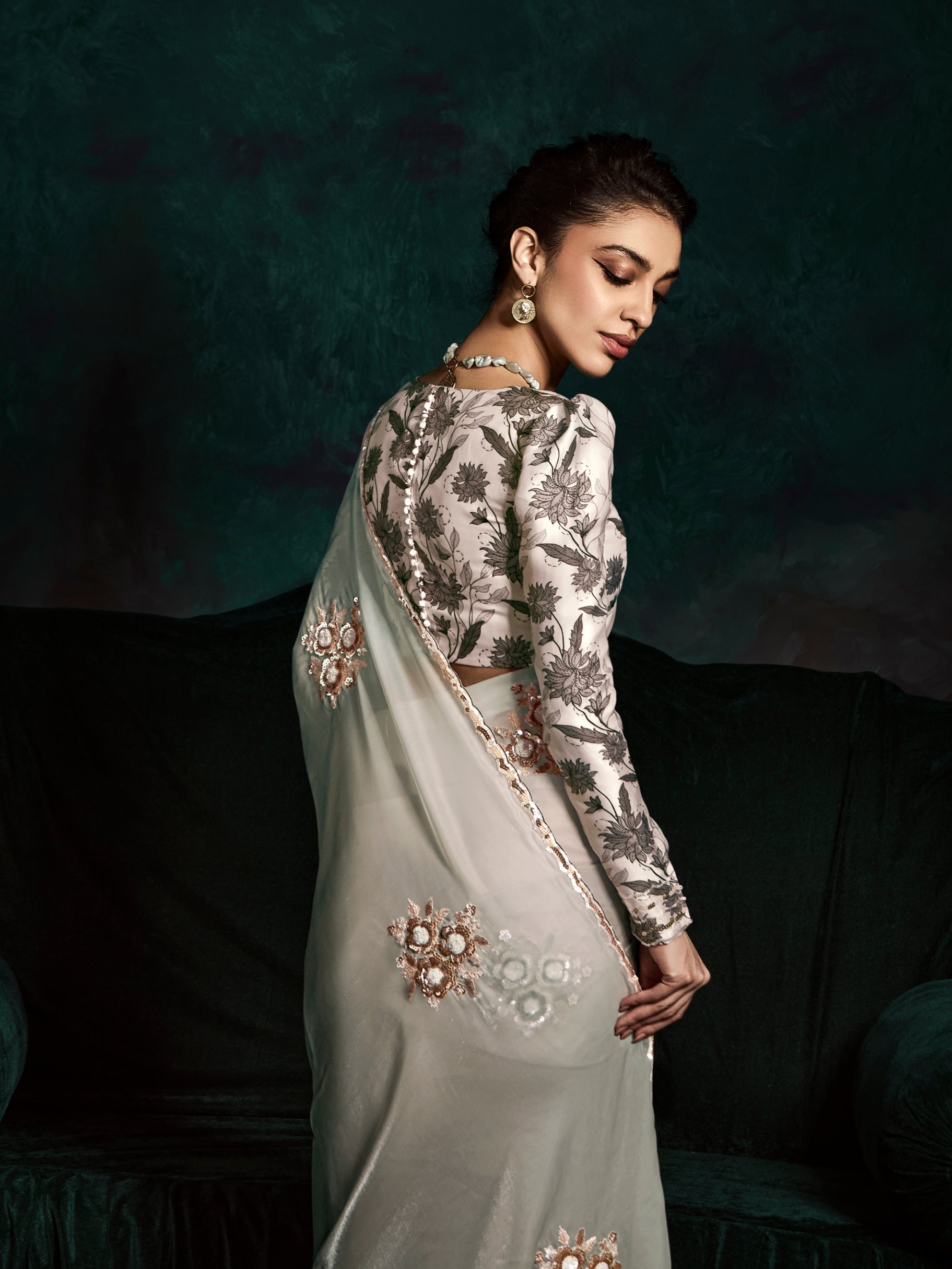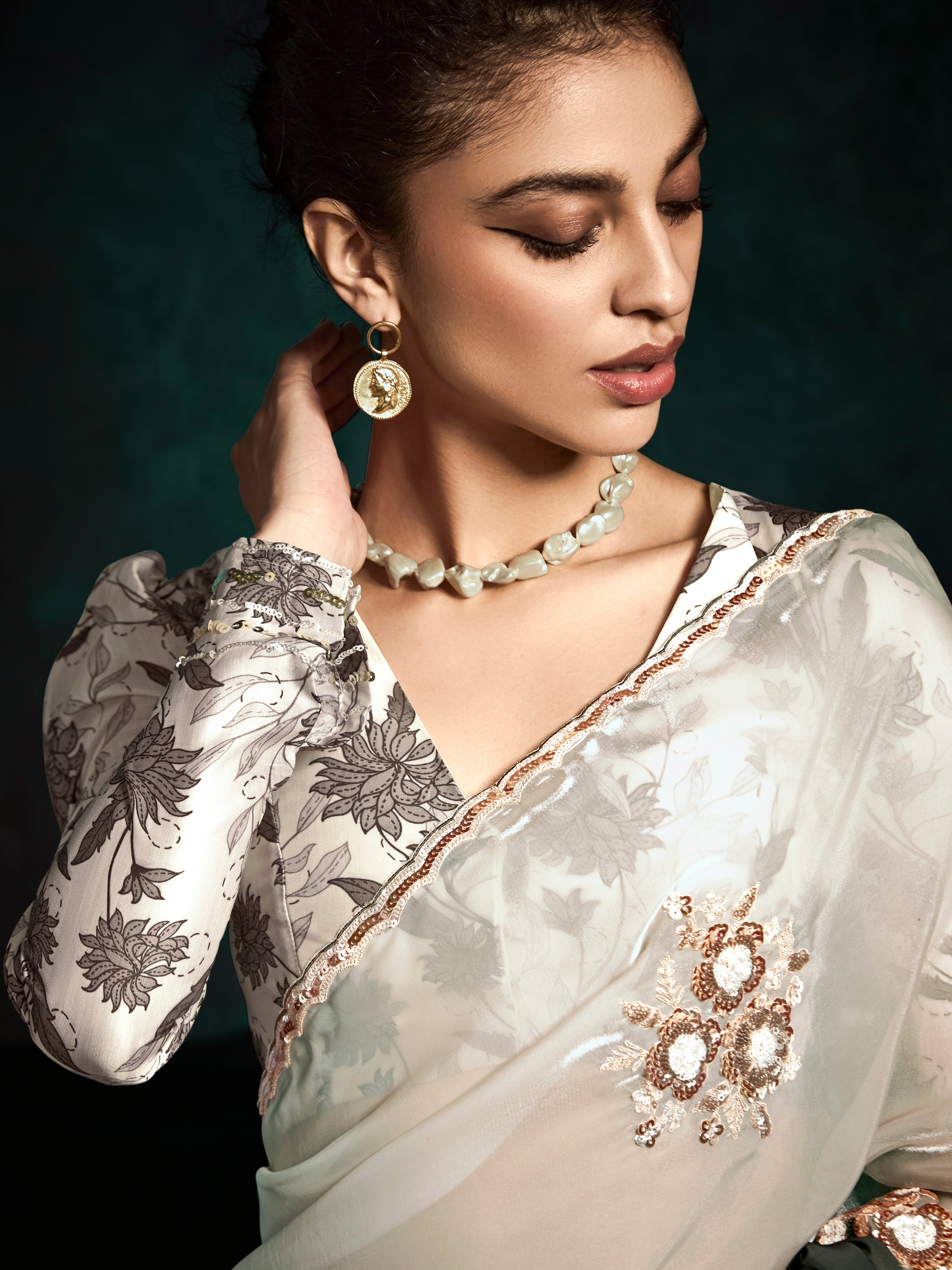 This saree comes with a dark green satin silk blouse featuring digital print and embroidery, giving a modern twist to a classic saree. The blouse adds depth and contrast, making the saree even more unique and elegant.