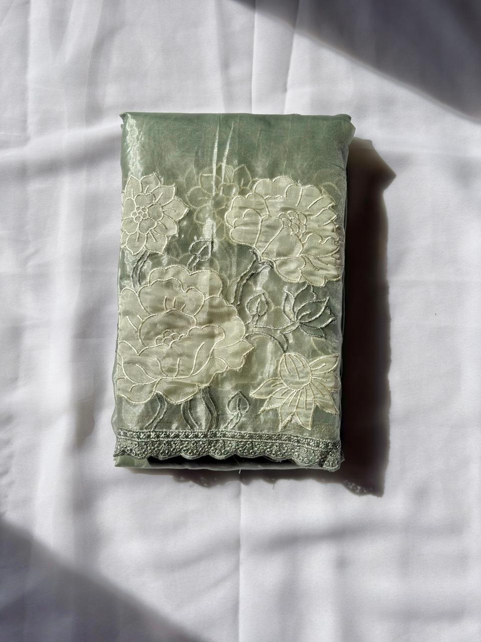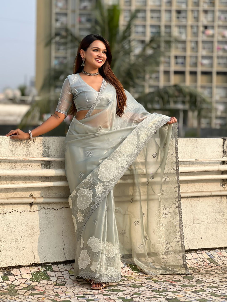 Grey Pure Oris Silk with Lotus Embroidery & Cutwork Border Saree