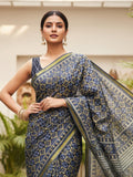 Grey Pure Soft Mal Mal Cotton Bagru Block Print Saree