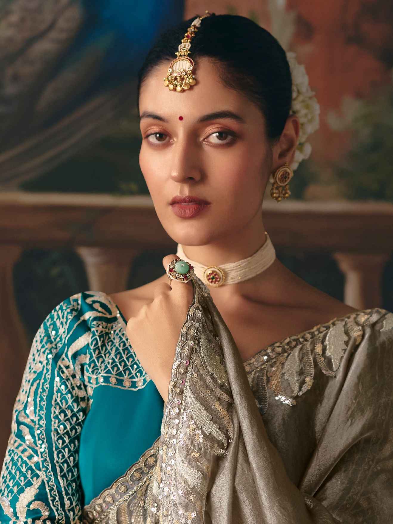 Grey Silver Fancy Saree with Sequins & Cutwork Border