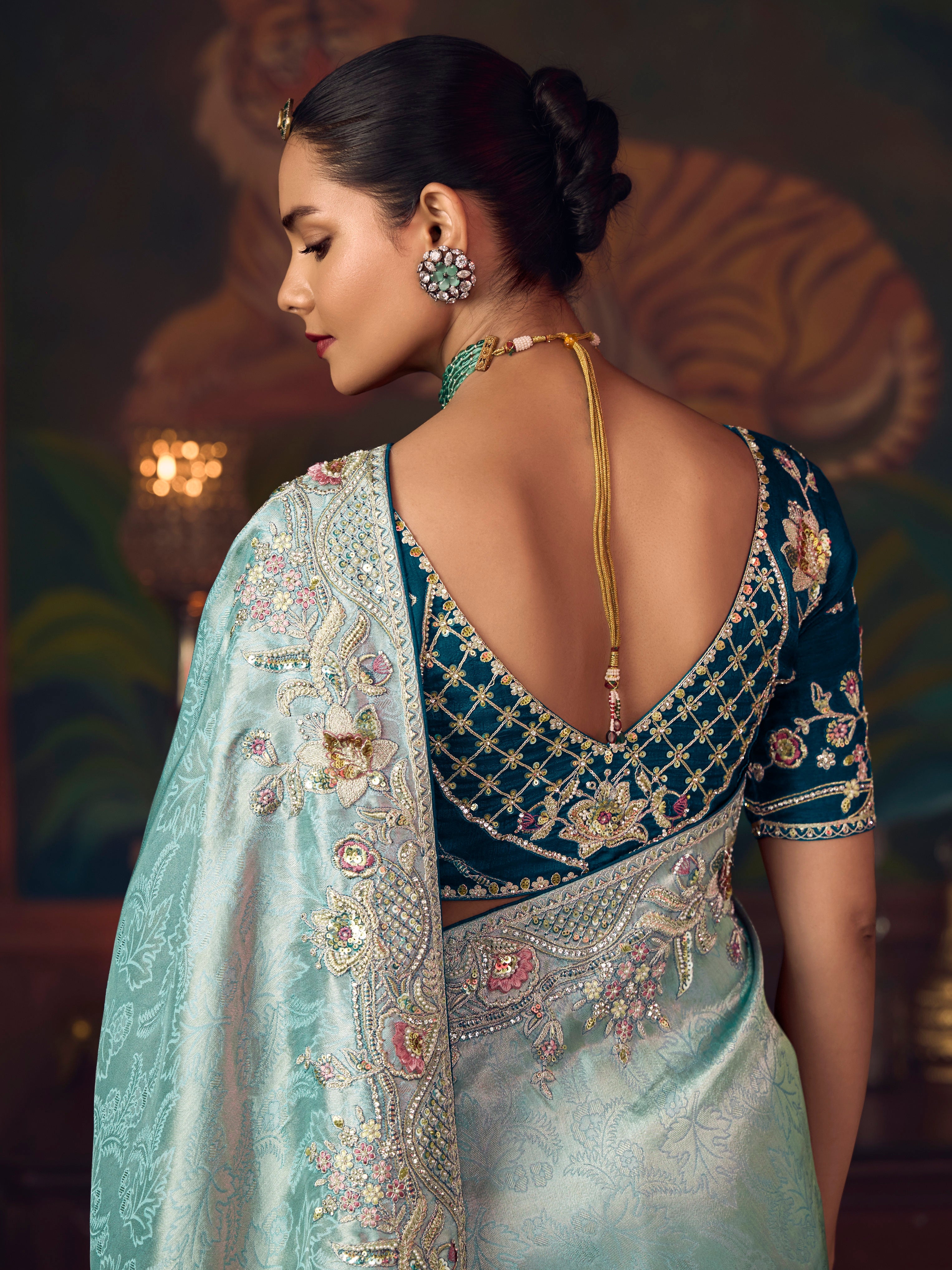Ice Blue Silk Saree with Heavy Floral Embroidery & Designer Border