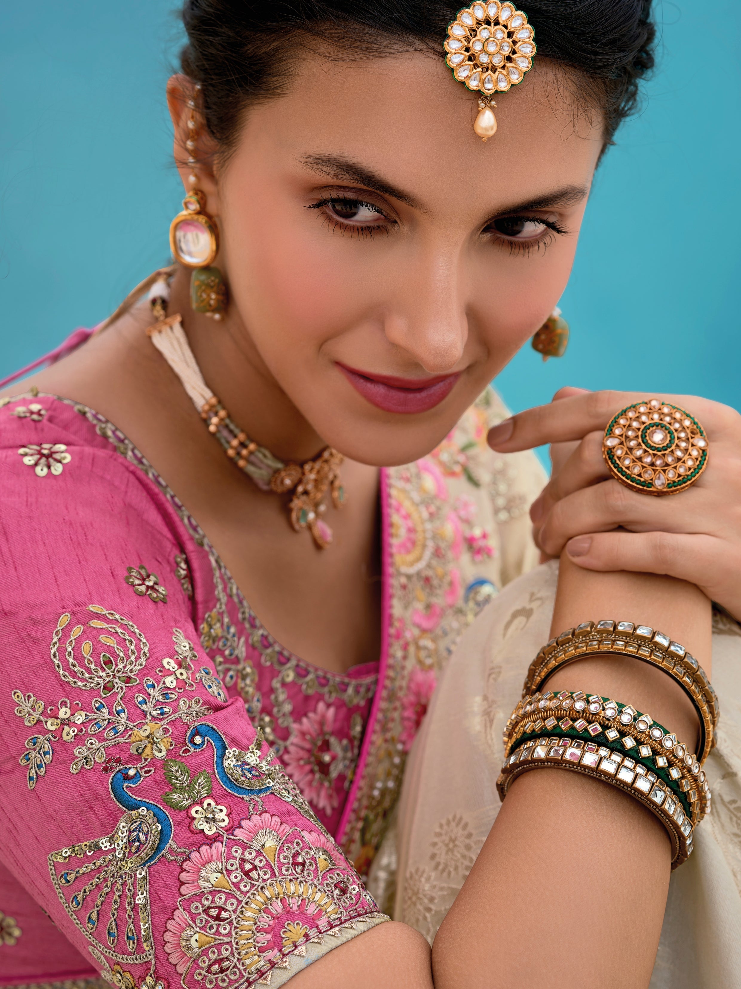 Pair it with Kundan jewelry, pearl accessories, or statement polki necklaces to elevate its royal charm. A sleek bun with jasmine flowers or a classic side-swept hairstyle will enhance its graceful appeal, making it the perfect ensemble for grand celebrations.