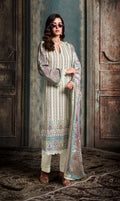 Embrace elegance with this Ivory White Straight Cut Suit. The pure muslin fabric with a digital print is beautifully adorned with scalloped resham embroidery on the sleeves and hemline, making it perfect for any elegant occasion.