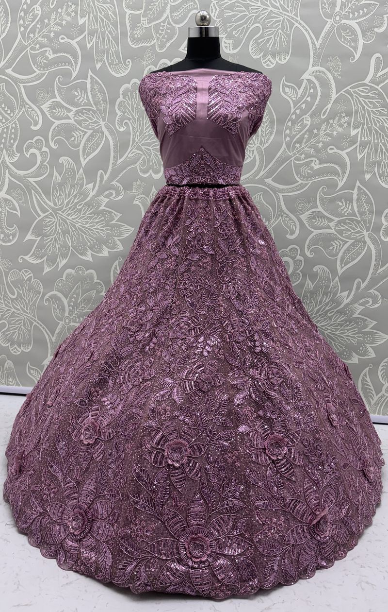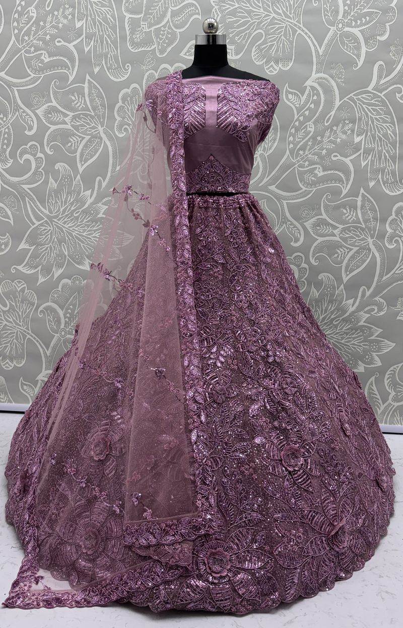 Lavender Pure Soft Net Heavy Embroidery Work Bridal Lehenga