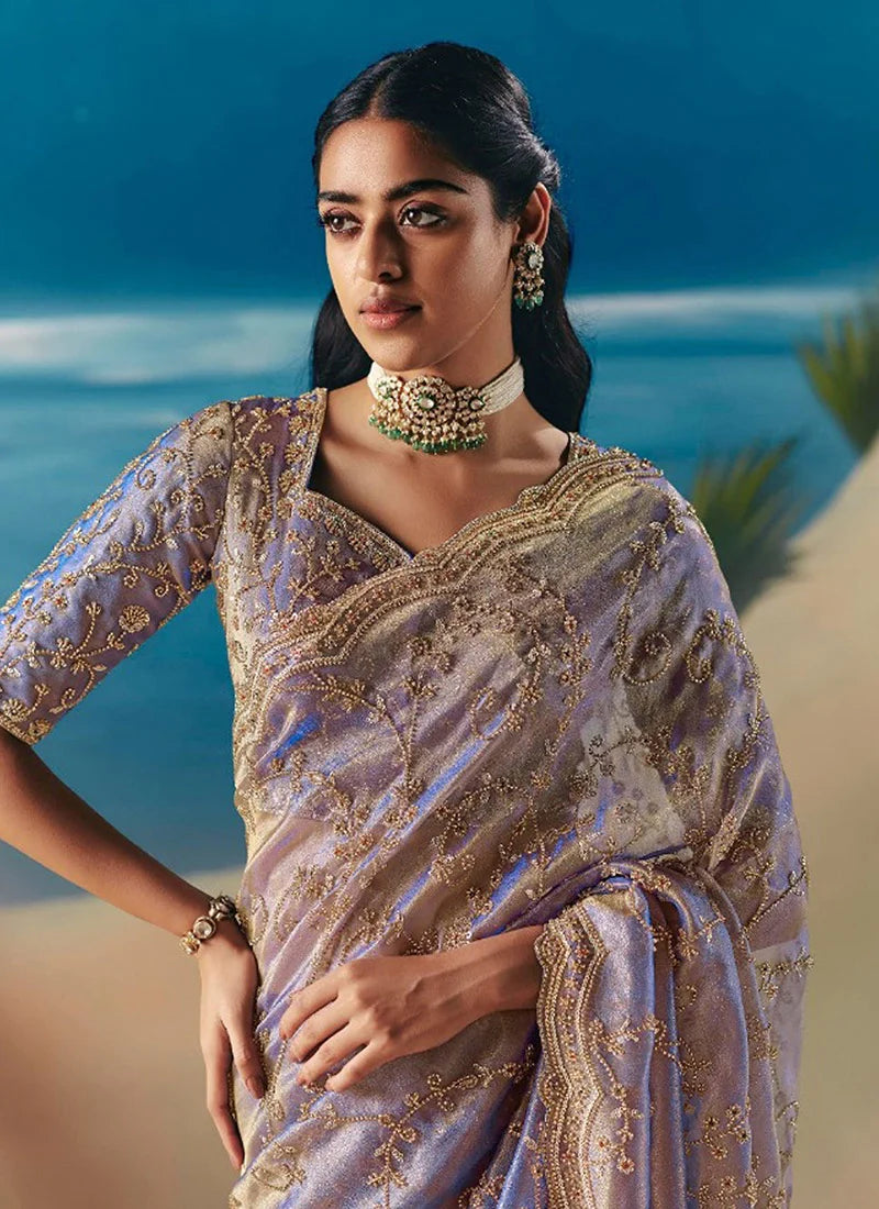 Lavender Fancy Organza Silk Zari Embroidered Sequins With Bridal Saree