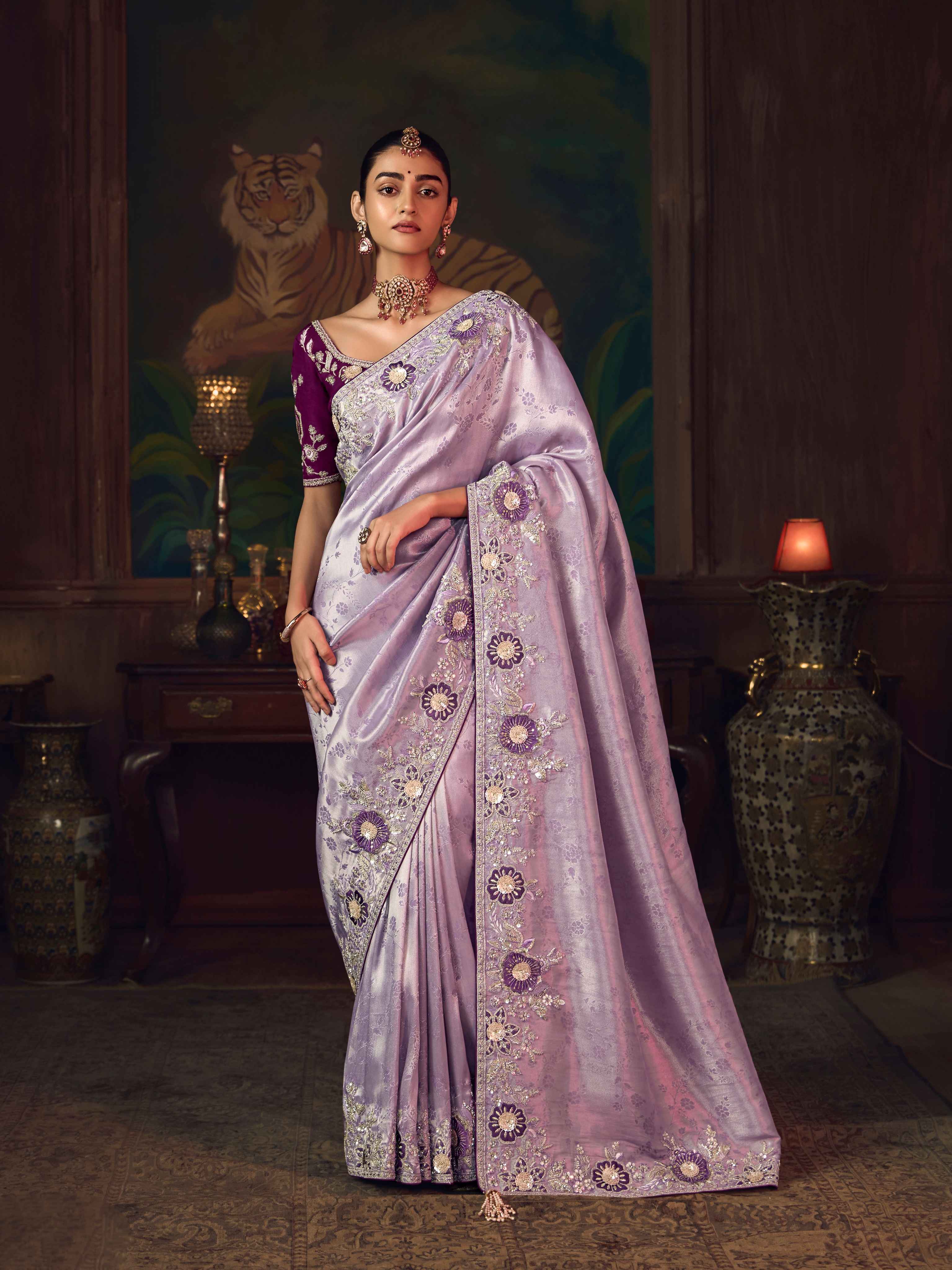 Lavender Silk Saree with Artistic Heavy Embroidery