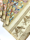 Soft Tussar Silk Sarees with Nature bird prints all over the body having arrow zari woven border on both sides