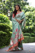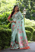 Soft tussar silk saree with beautiful floral print pallu and traditional printed border with all over flower butties and fancy tassels with contrast blouse pieceΒ