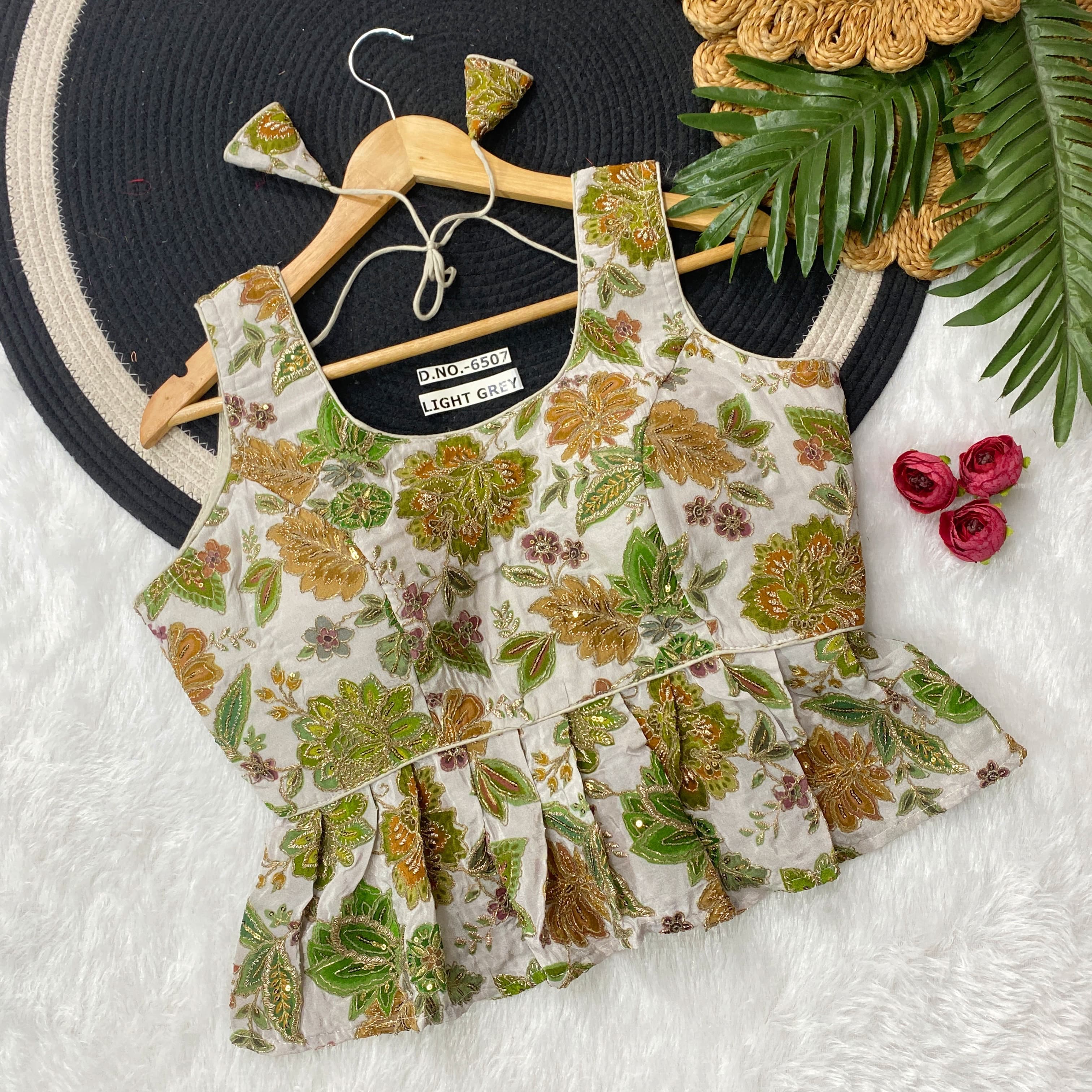 Light Grey Pure Crape Viscose Floral Print Half Sleeve Peplum Blouse