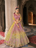 This bright lime yellow bridal lehenga is crafted from premium fancy silk and adorned with detailed mirror, sequin, and stone embroidery. Featuring an embroidered blouse and a heavy dupatta, it combines vibrant hues with elegant craftsmanship, making it an excellent choice for haldi ceremonies, weddings, and sangeet functions.