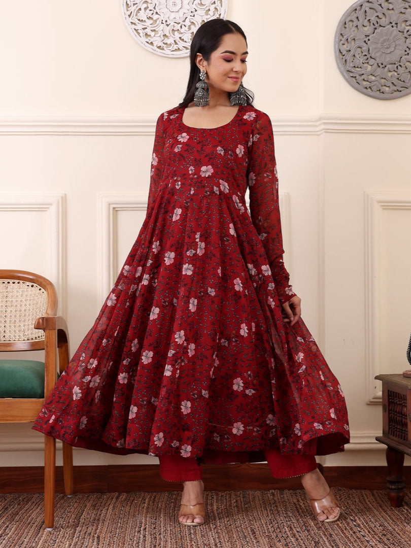 Maroon Digital Printed Anarkali Kurti Set with Dupatta