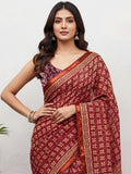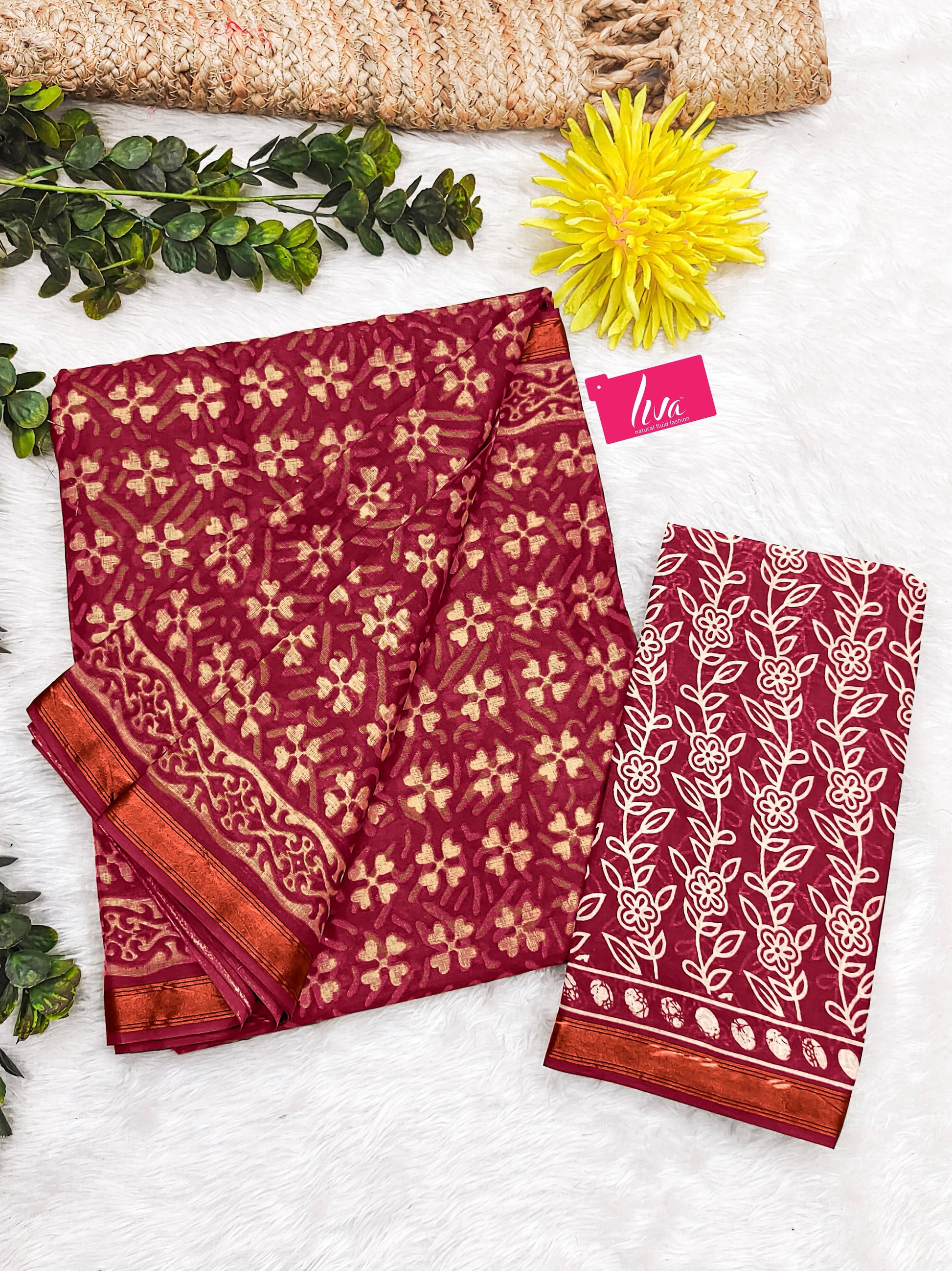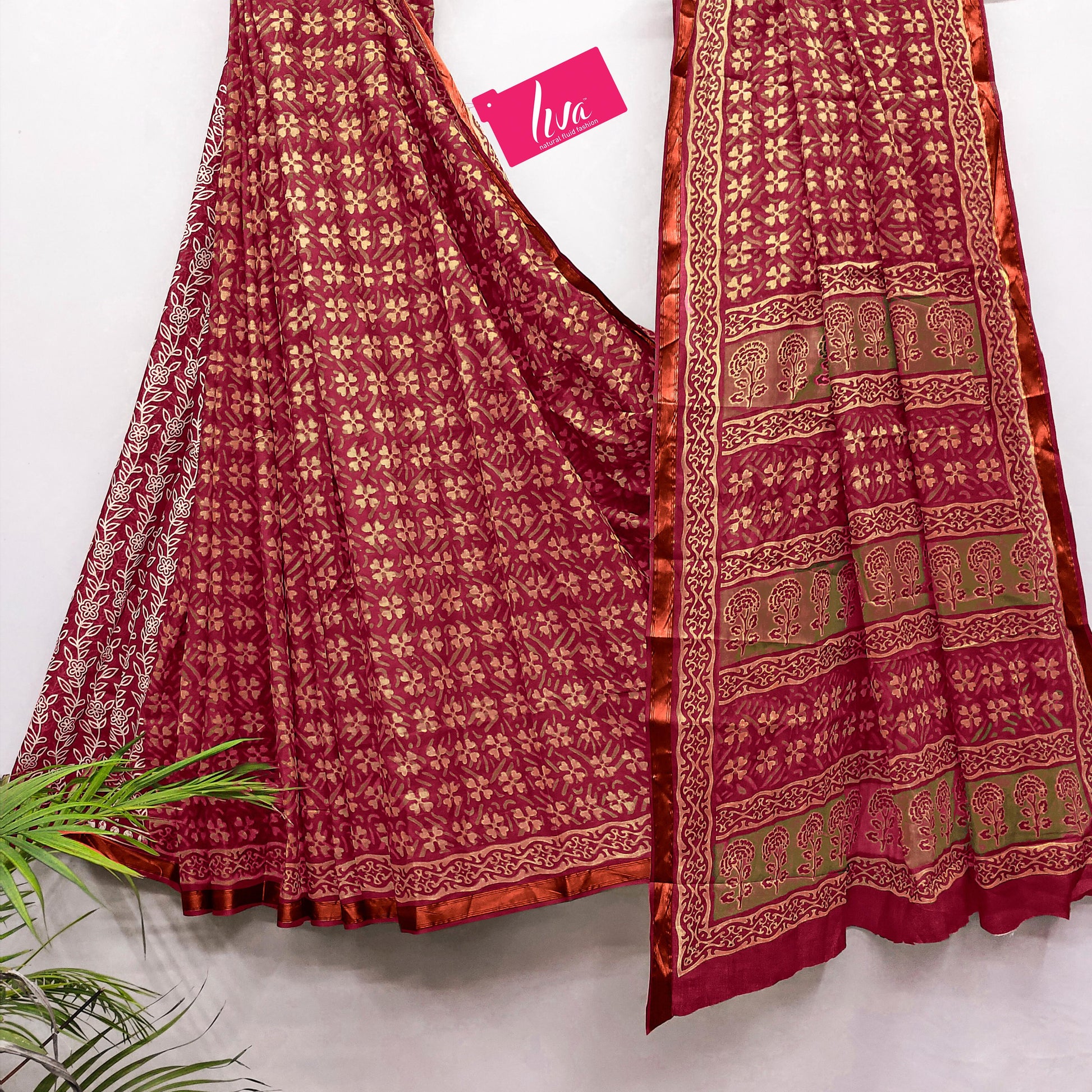 Maroon Pure Soft Mal Mal Cotton Bagru Block Print Saree