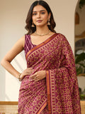 Maroon Pure Soft Mal Mal Cotton Bagru Block Print Saree