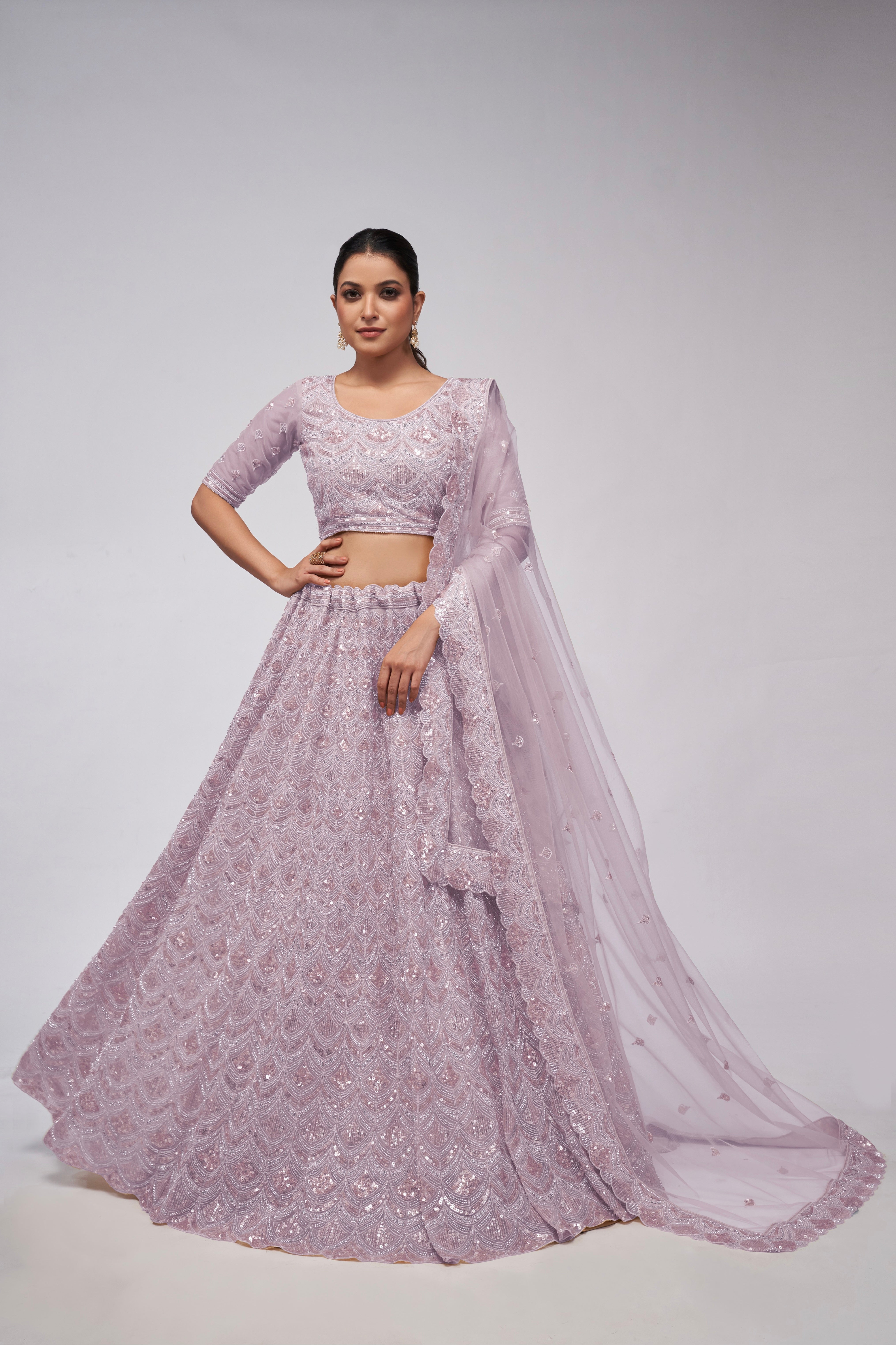 Lehenga: The lehenga, crafted from soft net fabric in a coordinating mauve shade, ensures a seamless and stylish appearance.