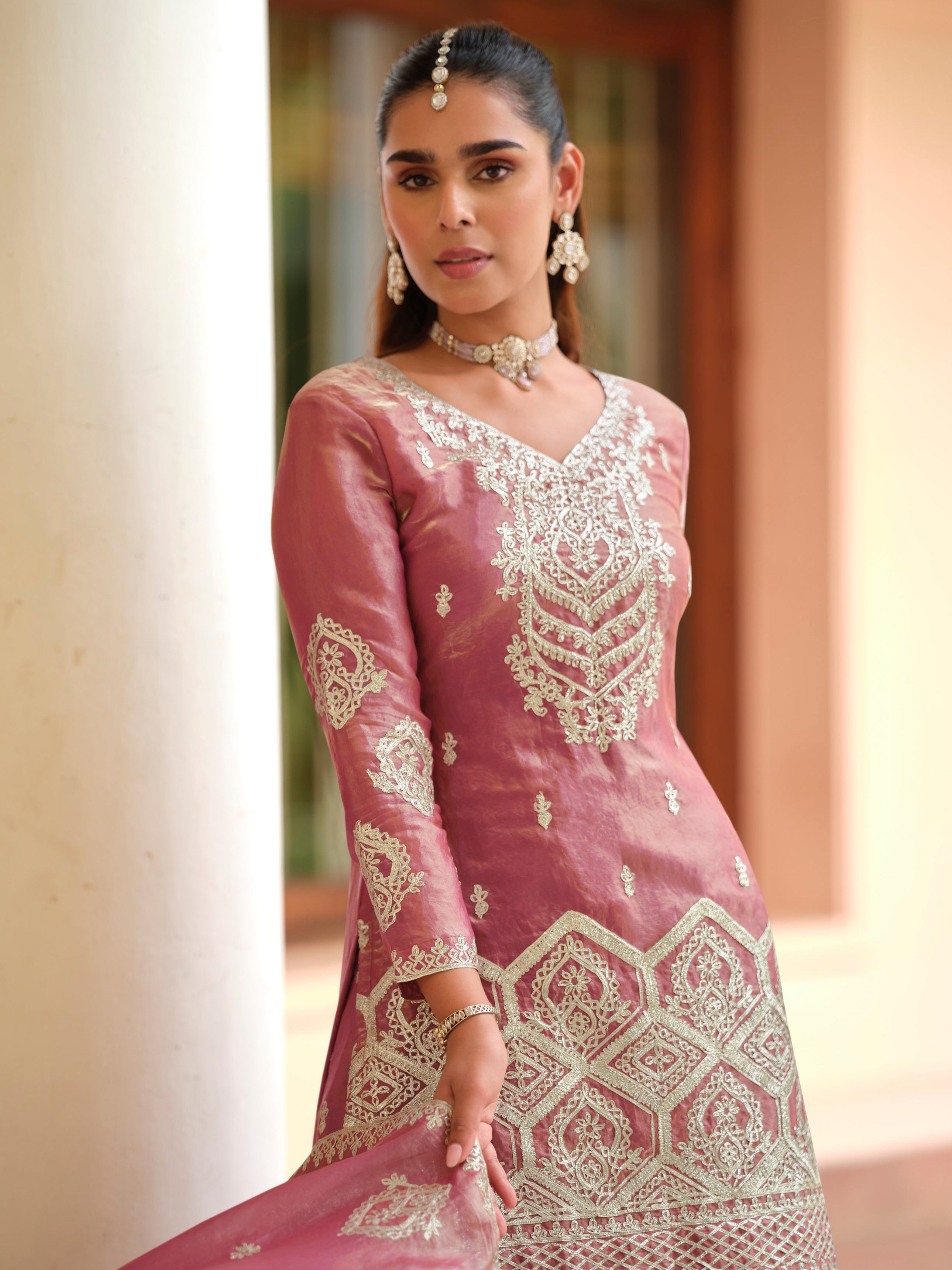 Mauve Premium Tora Silk Embroidered Palazzo Suit with Dupatta