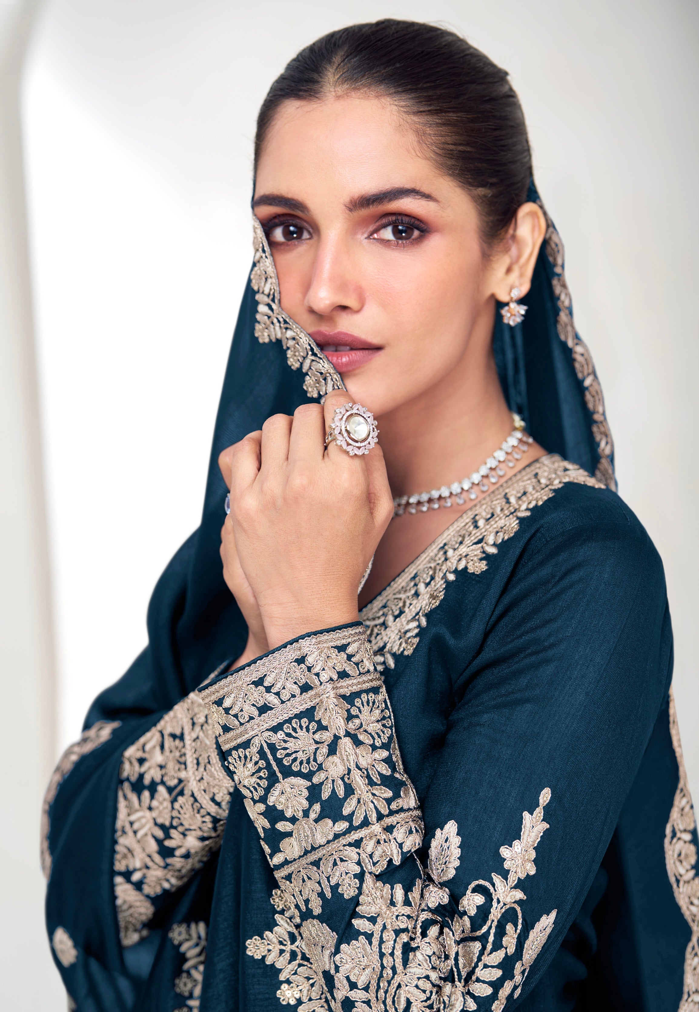 This midnight blue silk suit is perfect for a range of occasions, including evening parties, engagement ceremonies, and cultural events. The classic color and intricate embroidery make it an ideal choice for those who prefer understated elegance. Whether you're attending a Diwali function or an office party, this outfit will help you look refined and stylish.