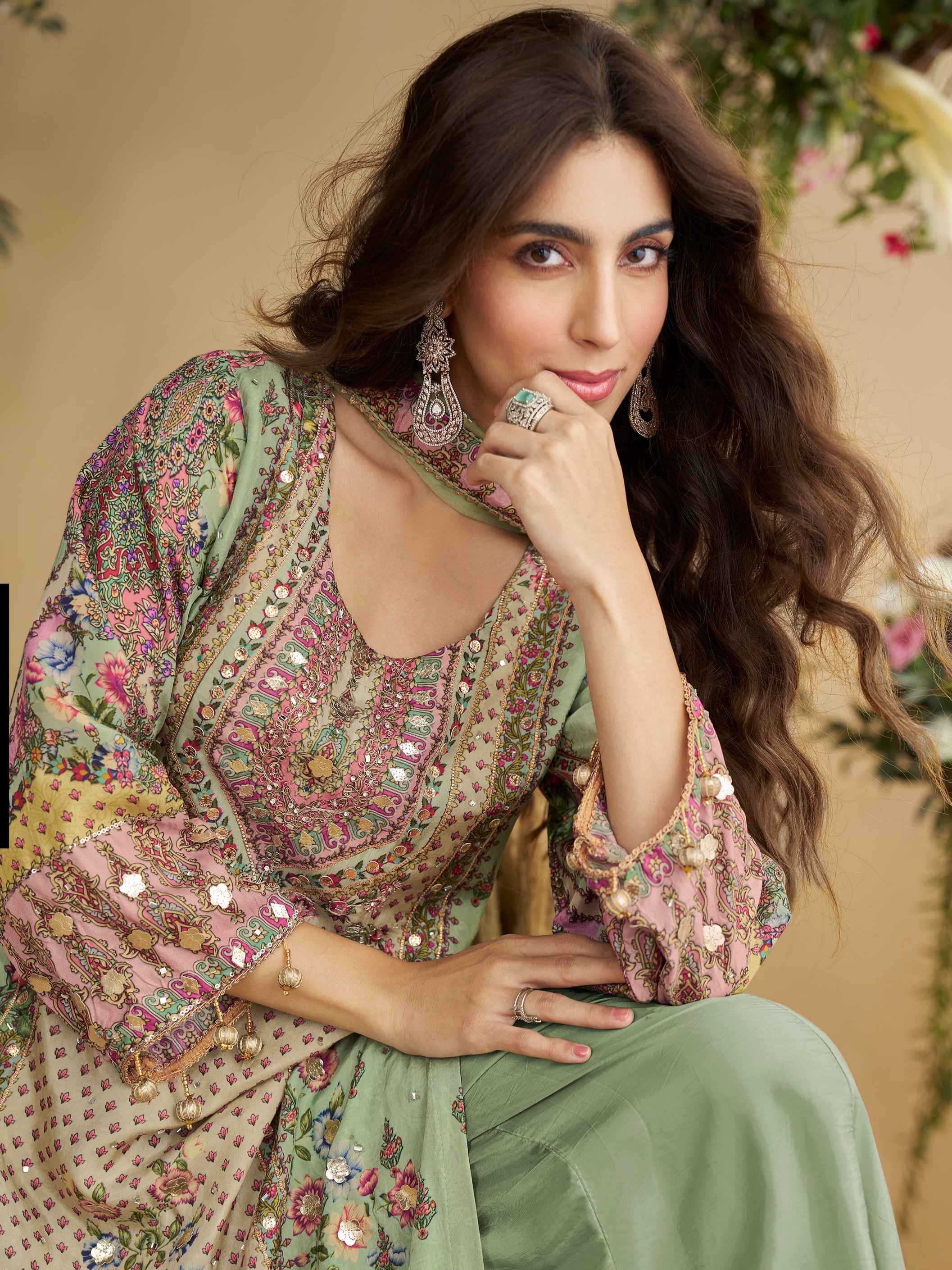 Mint Green Printed Crepe Silk Palazzo Suit with Hand Aari & Gota Work