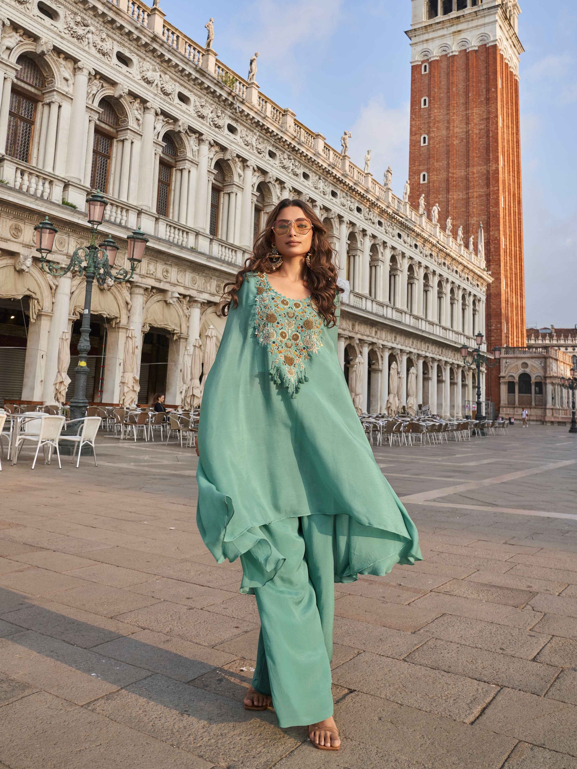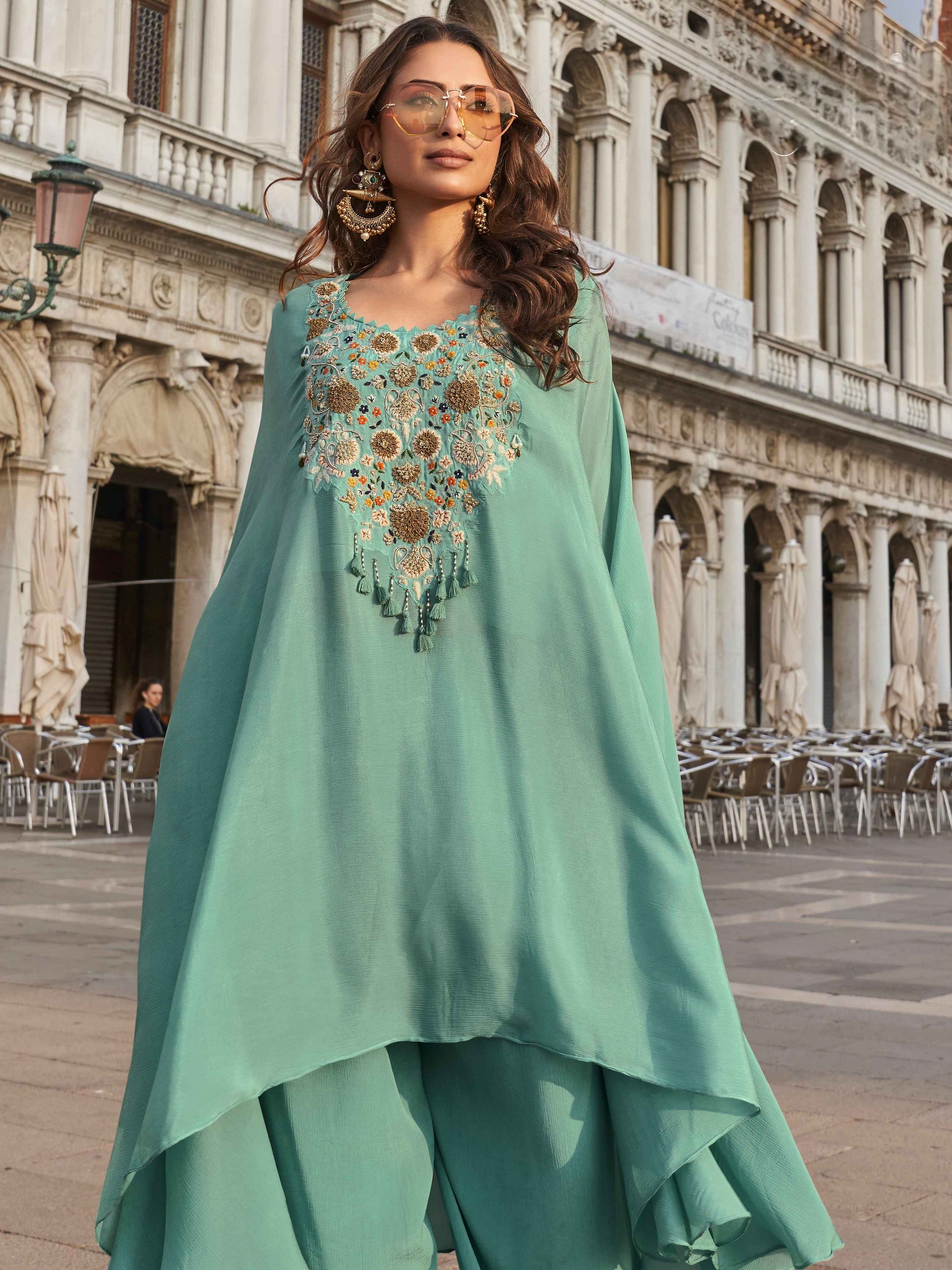 This mint green palazzo suit blends premium Real Chinon and French Crepe Silk to offer an effortlessly elegant ensemble. The long top showcases meticulous hand embroidery enhanced with delicate sequin details, adding a subtle festive shimmer. Complemented by matching palazzo pants, the outfit embodies refined sophistication, making it an ideal choice for both traditional celebrations and contemporary events.