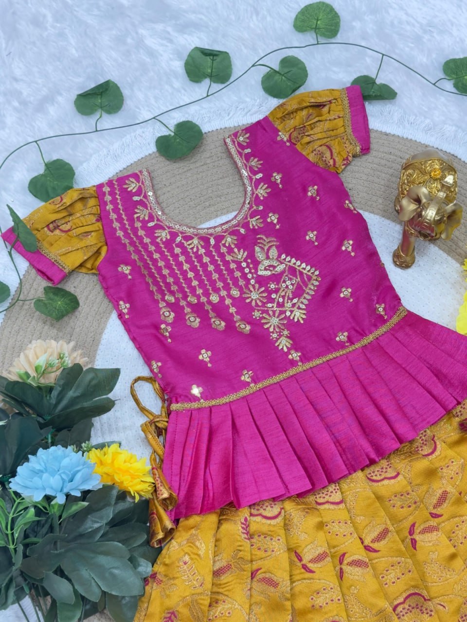 Mustard Pink Pure Silky Sartin Printed Kids Chaniya Choli