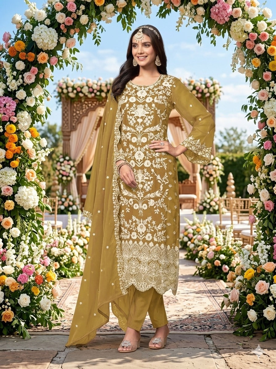 Mustard Pure Soft Organza Heavy Thread Work Salwar Suit