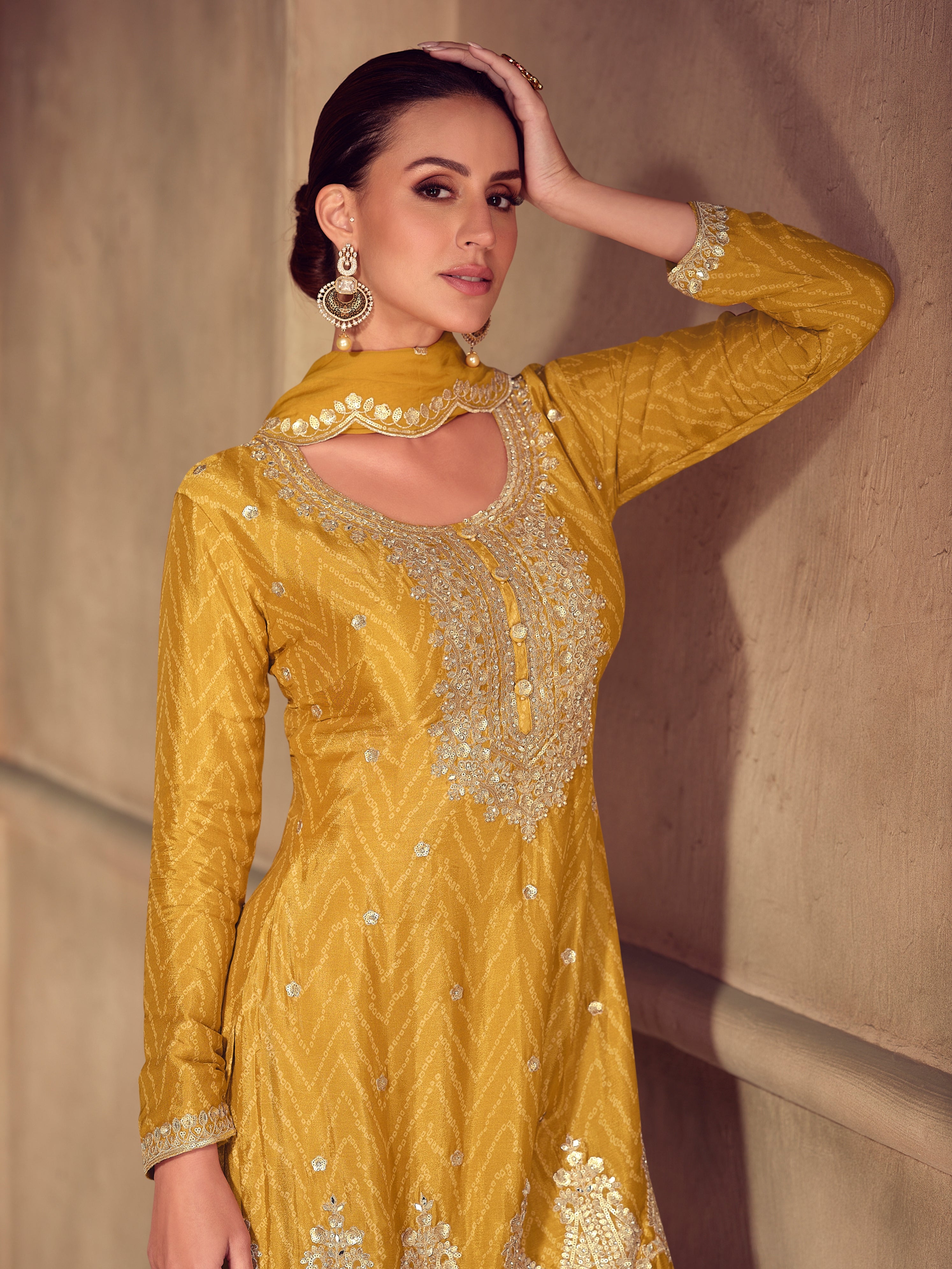 Mustard Yellow Chinon Embroidered Sharara Suit