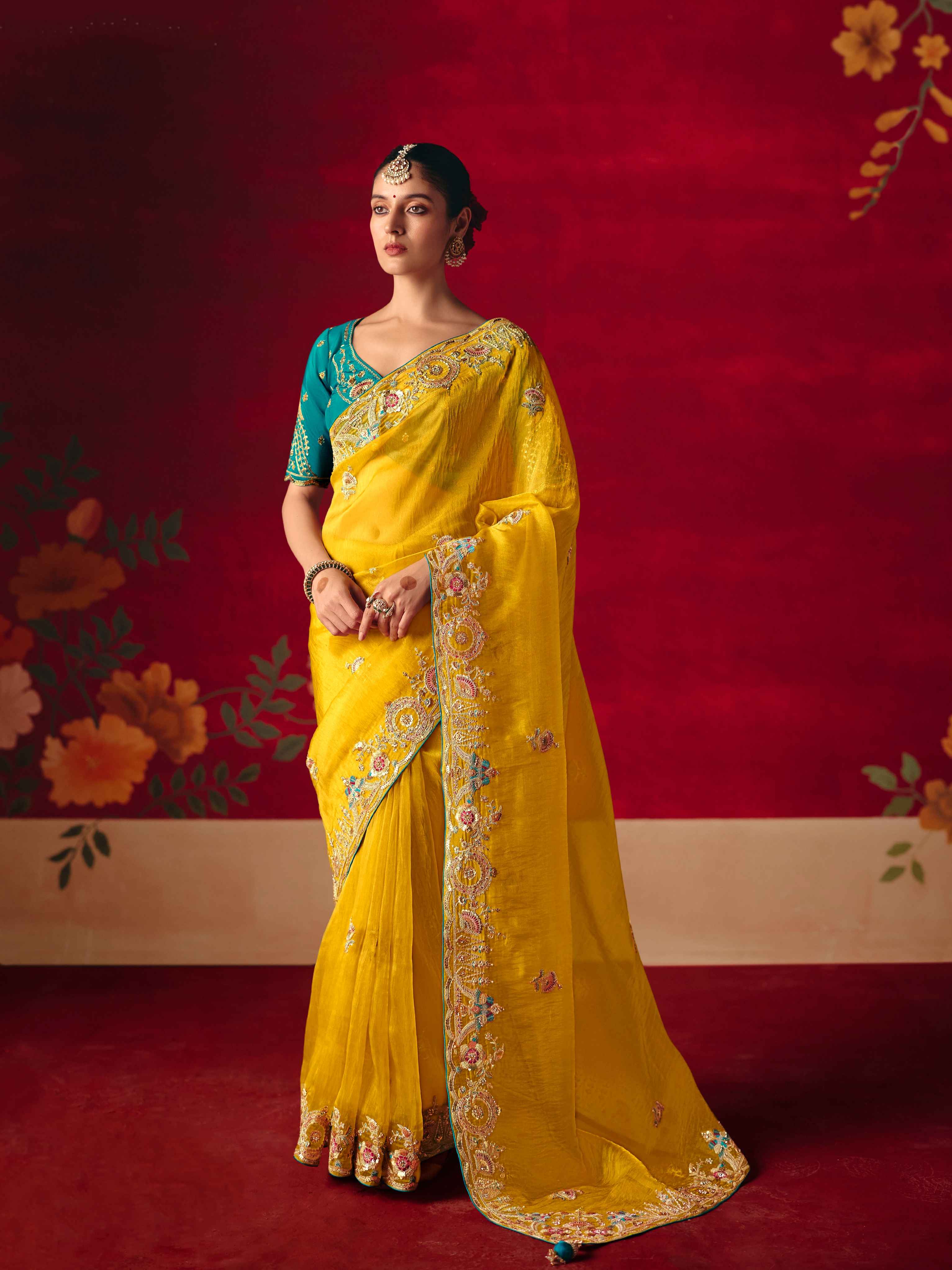Mustard Yellow Fancy Saree with Thread & Sequins Embroidery