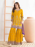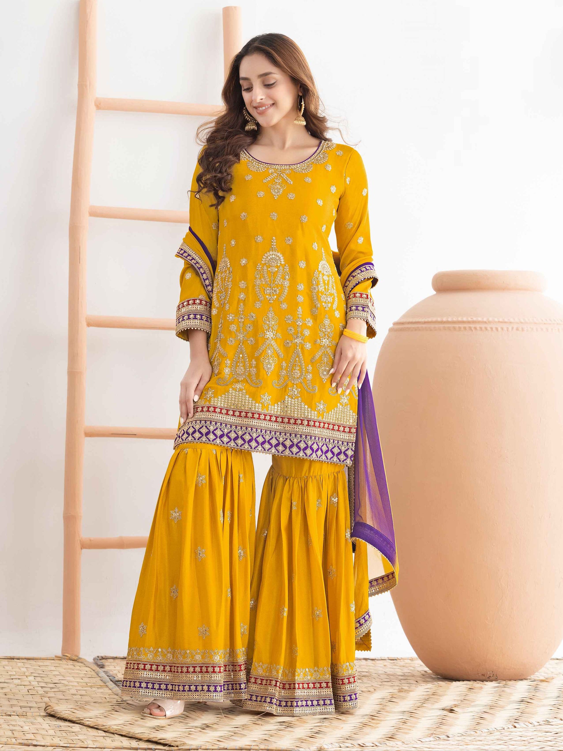 Mustard Yellow Festive Embroidered Chinnon Sharara Suit