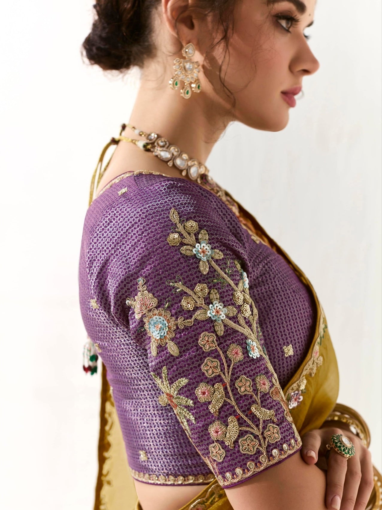 Mustard Yellow Organza Tissue Saree with Heavy Border Work