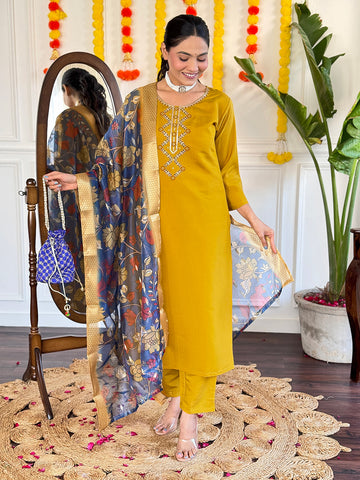 Add a touch of elegance and tradition to your wardrobe with this mustard yellow embroidered Viscose Chanderi Kurti set, designed for modern women who love ethnic fashion. This three-piece suit set features a graceful embroidered kurti, comfortable matching pants, and a luxurious jacquard dupatta, making it a perfect outfit for festive occasions, weddings, and celebrations. The rich mustard yellow shade, intricate embroidery, and contrasting dupatta ensure a stylish and sophisticated look.