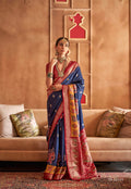- Design: This saree features a classic Patola design with intricate patterns in navy blue and gold. The rich colors create a regal look.