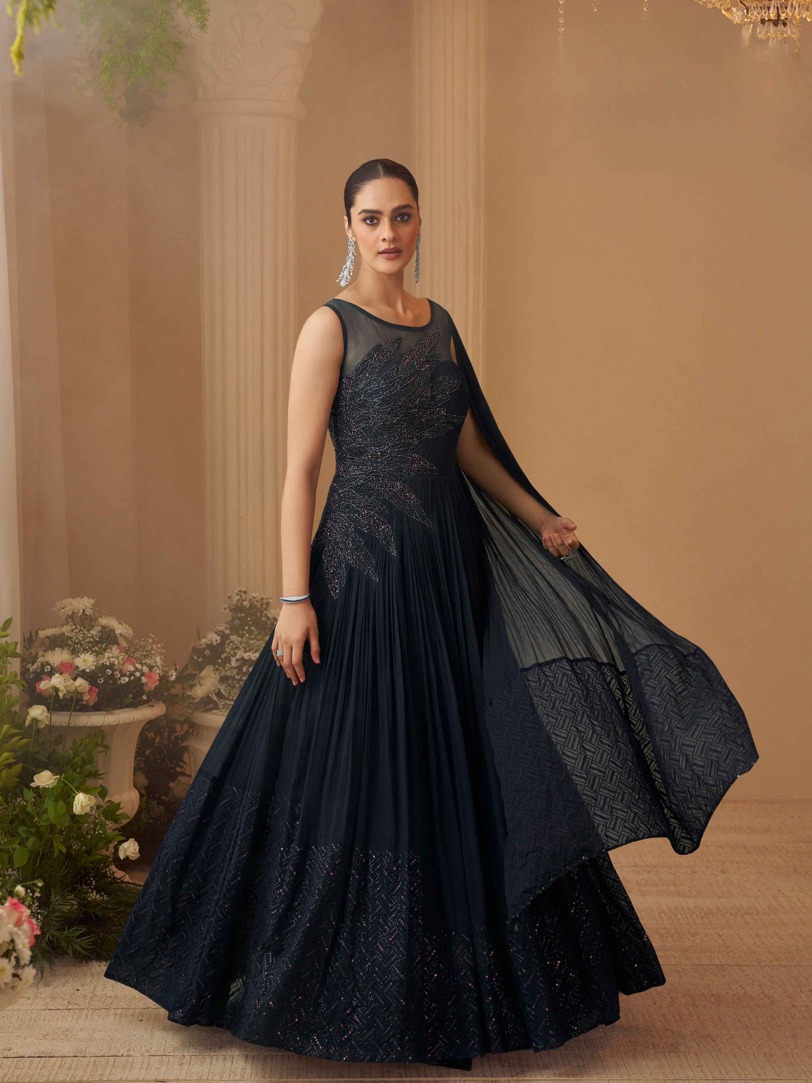 Navy Blue Heavy Embellished Chinon Silk Reception Gown