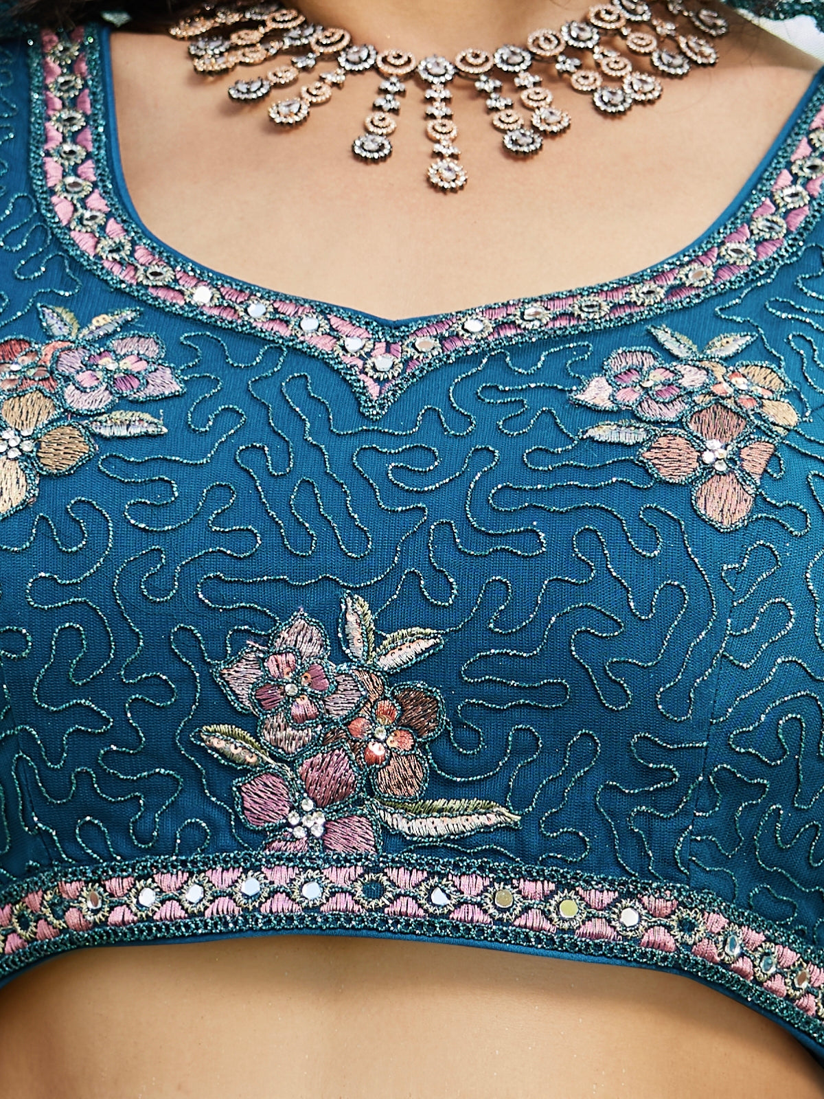 Designer Blouse: The sweetheart neckline blouse fabric is crafted from navy blue net, featuring heavy sequin and thread embroidery. Comes with a shantoon inner for added comfort and structure.