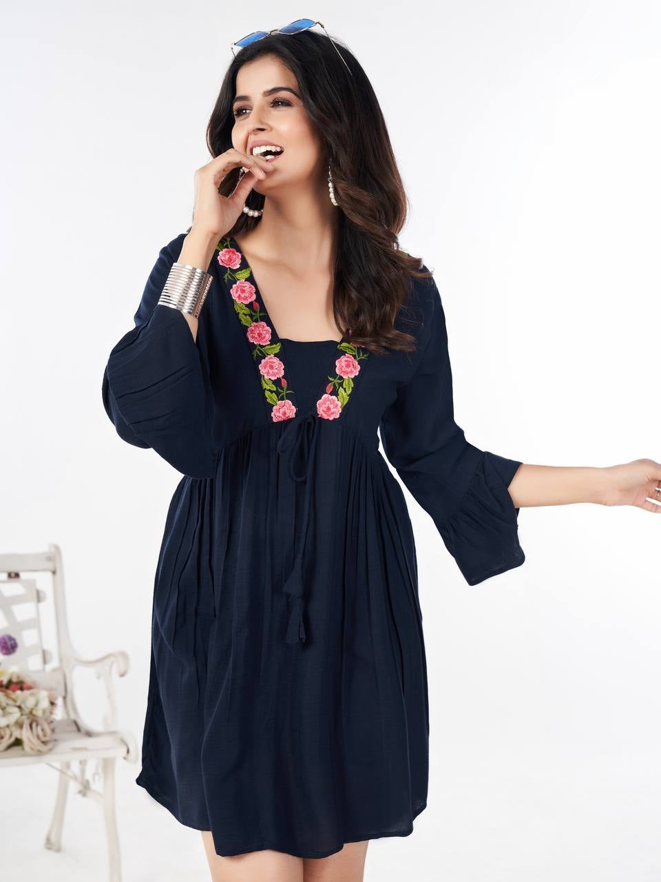 Navy Blue Pure Reyon Heavy Embroidery Stylish Fancy Sleeves Short Top